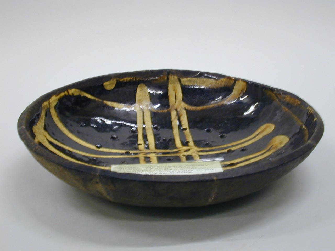 - A large round collander of buff earthenware covered with a black slip decorated with trailed lines of white slip. Glazed with a yellow lead glaze.The sides, rim and base are unglazed.