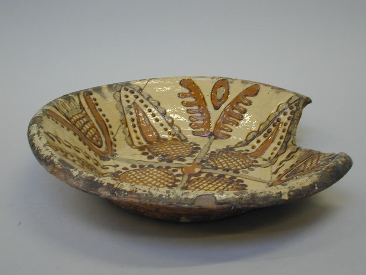 A large plate or charger of red earthenware, with a buff glaze decorated with stylised flowers and geometric patterns in grey, light brown and brown slip. Sides and base unglazed.