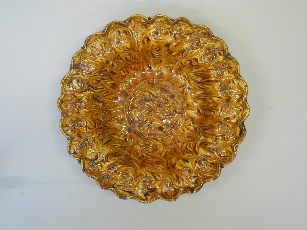A bowl with a buff-coloured earthenware body, The body is ribbed and decorated in the centre and around the rim with face masks. The bowl is covered with a marbled pattern of black, brown and white slips. Glazed with a plain yellow glaze. The underside of the bowl is glazed.