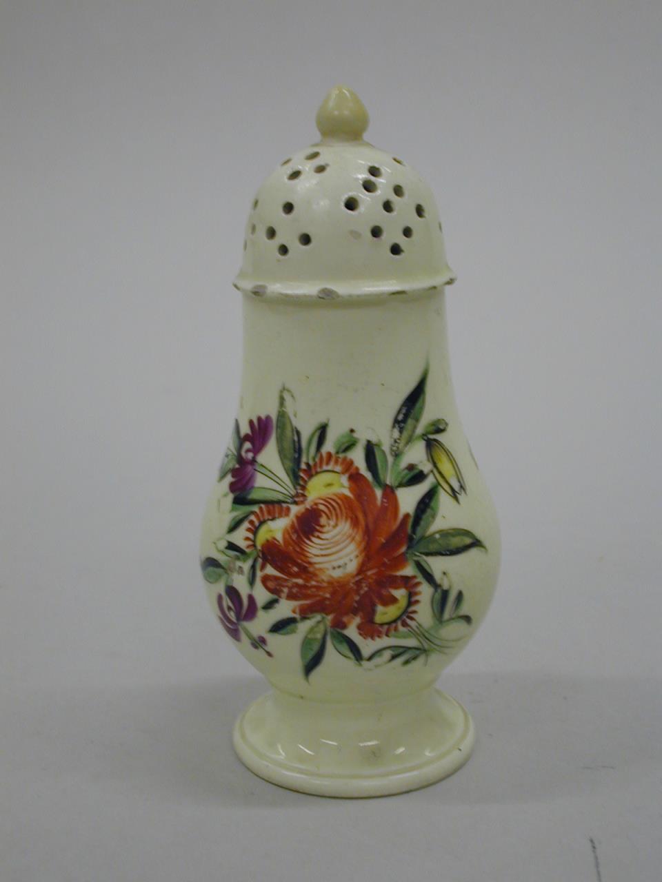 - A creamware salt or pepper caster. Painted with sprays of flowers over the glaze in colours. The glaze has a strong green tinge.