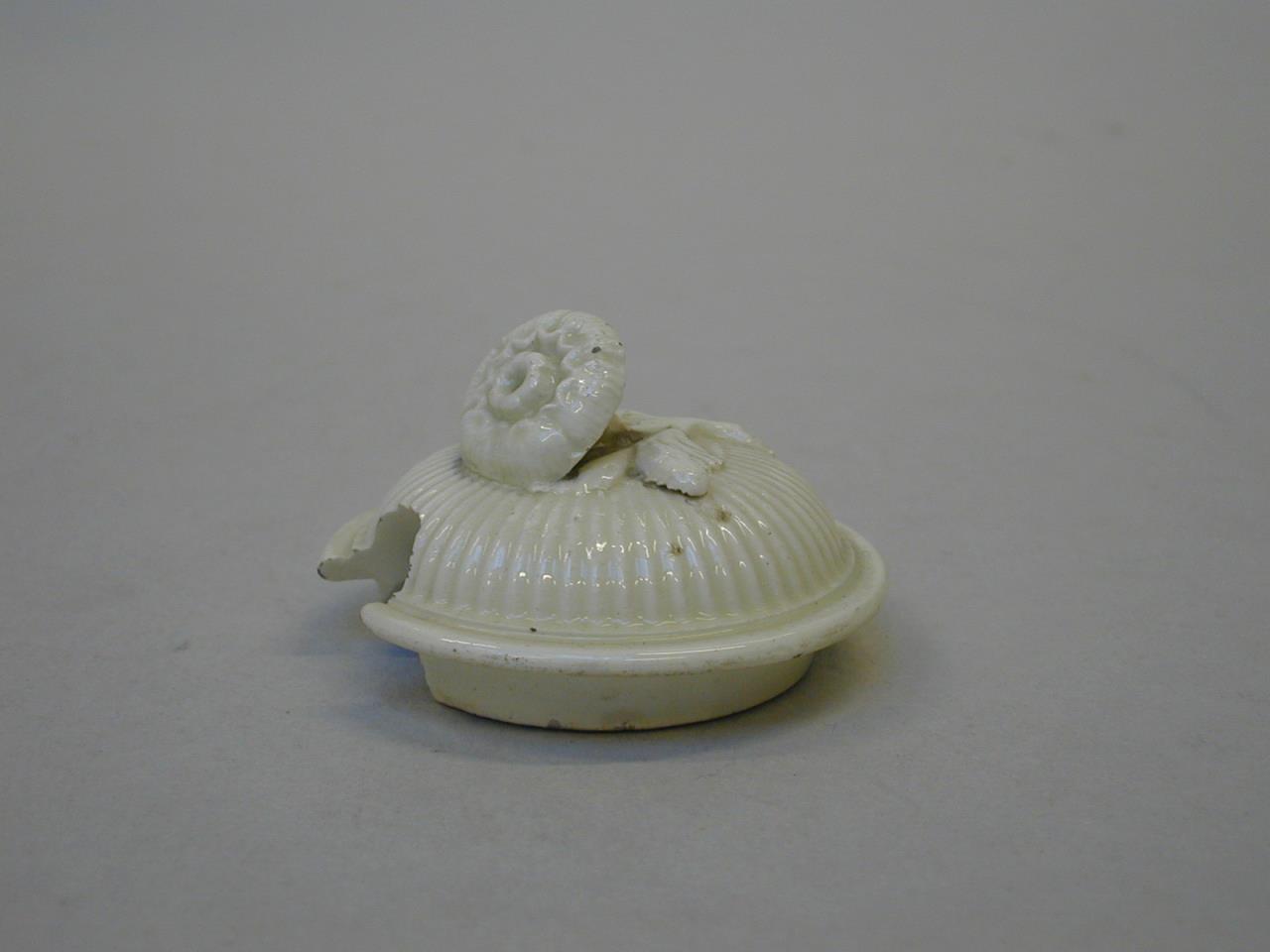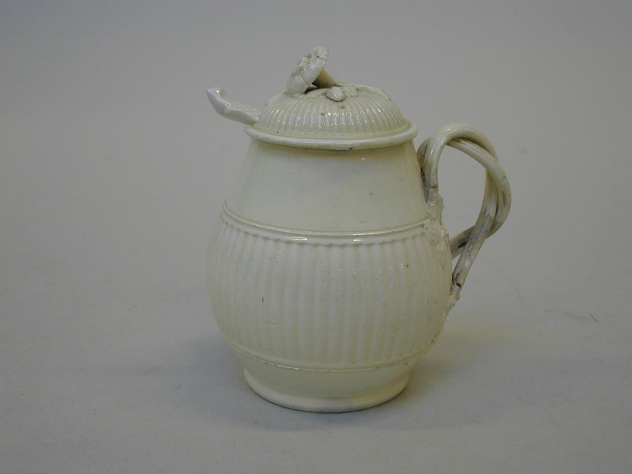 - A Creamware mustard pot. Barrel shaped with a ribbed waist. The handle is double entwined with foliate terminals. The cover has ribbed decoration and is topped with a moulded flower finial. The spoon has a small circular bowl with moulded foliate decoration to the tip.