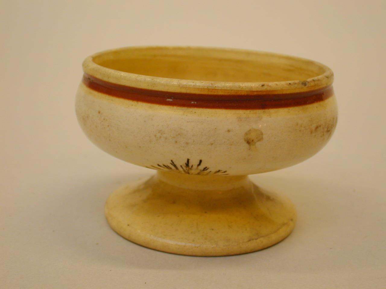 - A Creamware salt bowl on splayed foot. The glaze is very yellow, with a paler band around the body decorated with trees painted under the glaze in a dark brown.