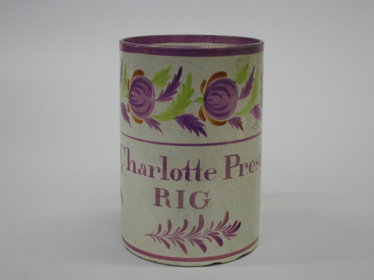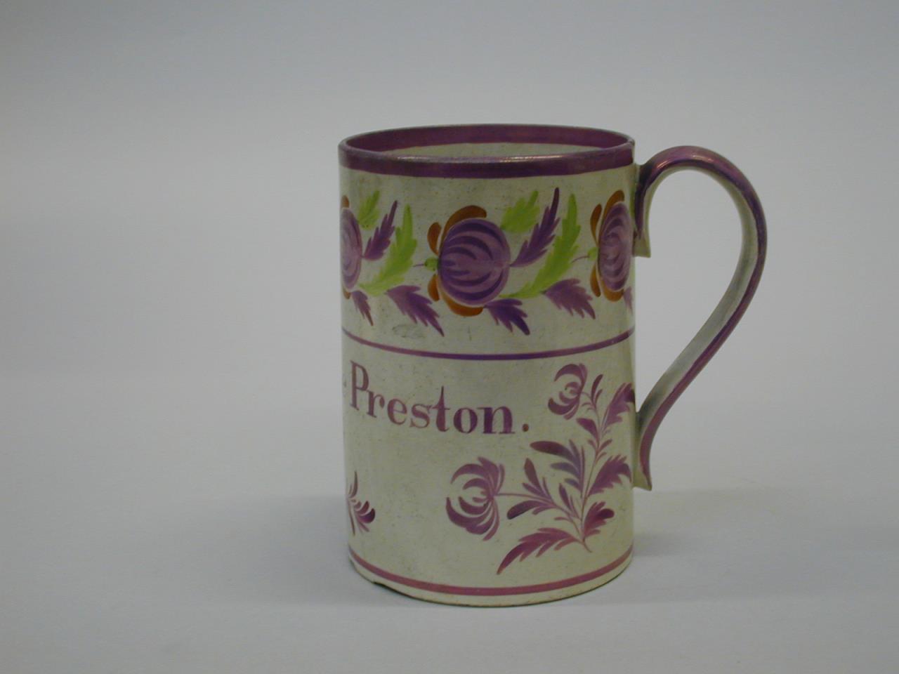 A Lusterware mug decorated with a band of pink lustre around the rim and on the top of the handle. Around the top of the mug is a broad floral border painted in pink lustre, green and yellow, the lower half of the mug decorated with pink lustre foliage and an inscription.