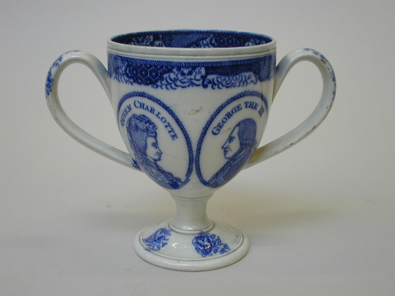 - A Pearlware Loving cup decorated with blue underglaze transfer prints of medalions of King George III, Queen Charlotte, the Royal coat of arms and a sailing ship. The foot and handles are decorated with sprays of flowers. The rim and foot of the cup has turned decoration with a blue geometric print on the inside and outside of the rim.