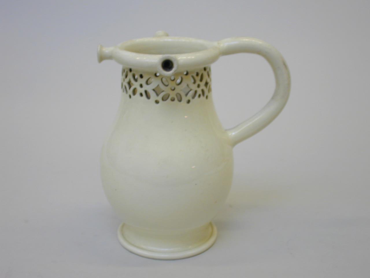 - A Creamware puzzle jug with a moulded foot, pierced gallery and three spouts projecting from the rim.