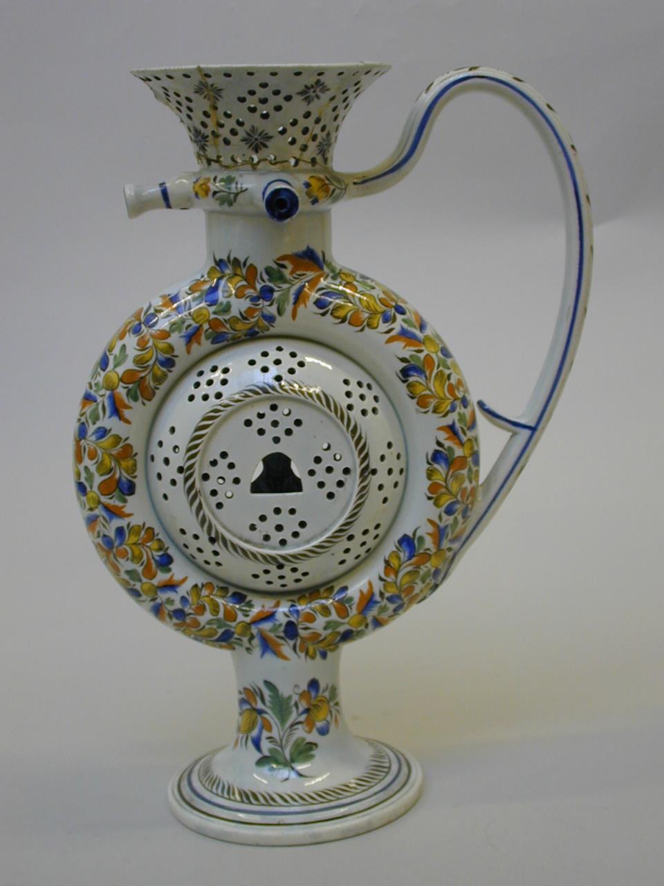 - A large Pearlware puzzle jug with a pierced gallery and three spouts projecting from the neck. The body is a flatened disc with a reticulated centre with a small figure of a soldier vissible inside. The jug stands on a circular moulded foot connected to a the body by a plain stem. The body, stem and foot are painted with sprays of foliage in brown, yellow, green and blue.