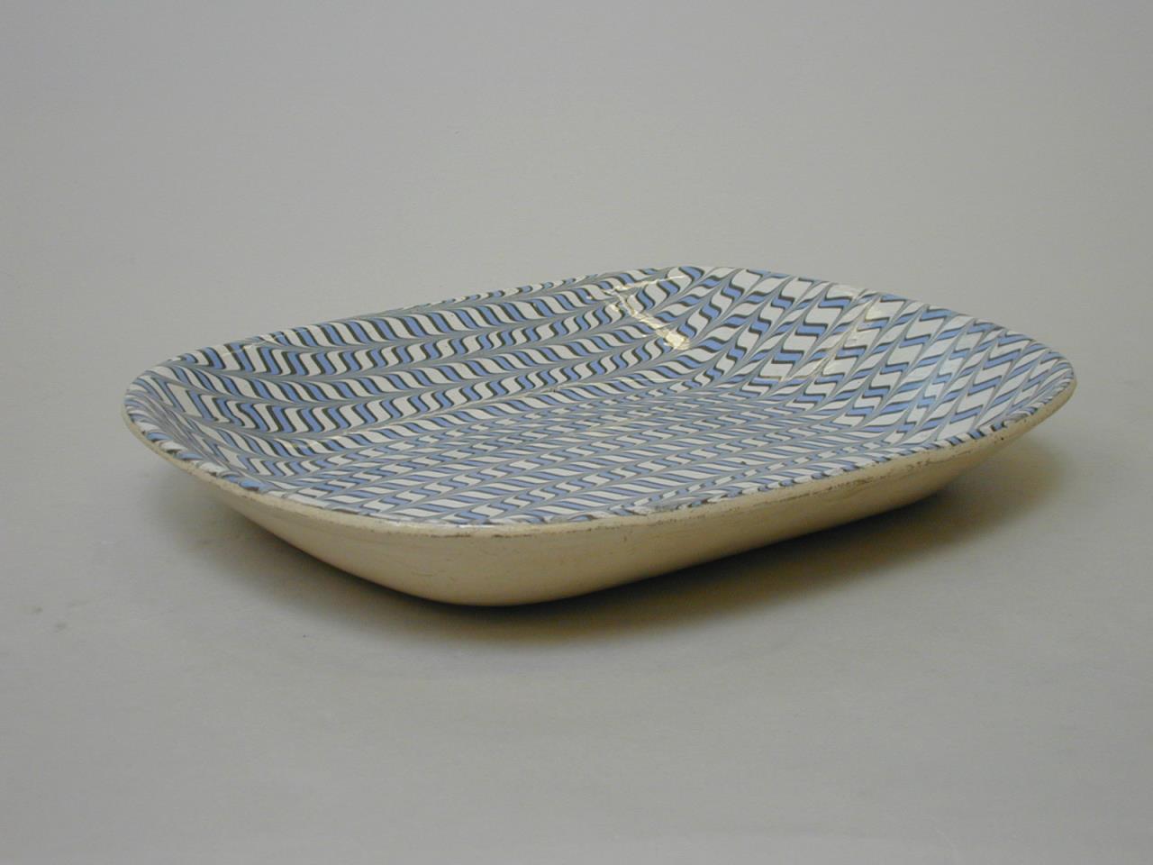 - An oblong earthenware meat or serving dish known as a Welsh Tray. Decorated with a combed slip pattern of white, blue, and black. The outside of the tray has a cream or buff coloured glaze.