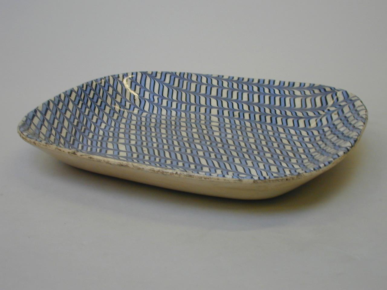 - An oblong earthenware meat or serving dish known as a Welsh Tray. Decorated with a combed slip pattern of white, blue, and black. The outside of the tray has a cream or buff coloured glaze.