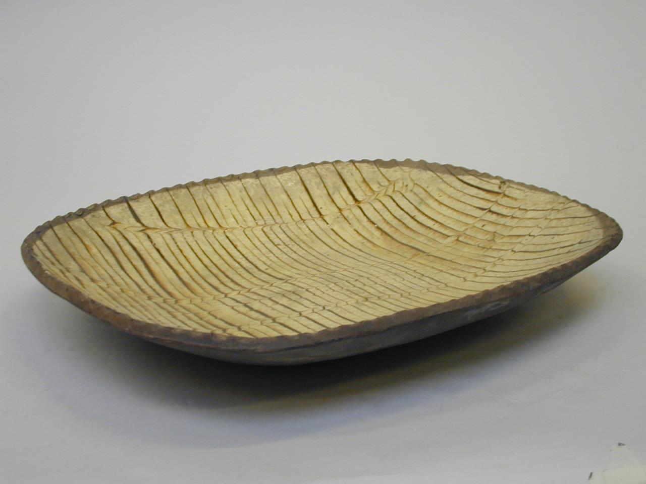 - An oblong earthenware meat or serving dish known as a Welsh Tray. Decorated with a combed slip pattern of cream and brown. The underside of the tray is unglazed with finger impressions around the rim.
