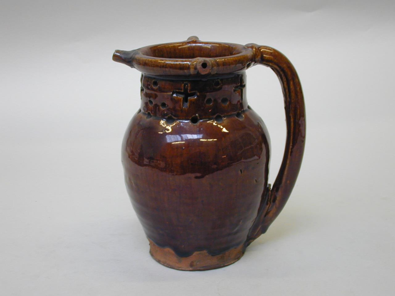 A puzzle jug of red earthenware the body coated with a brown glaze with dark streaks, the glaze carried down to just above the base. The neck of the jug is pierced with a pattern of circles and crosses.The rim has three small spouts.