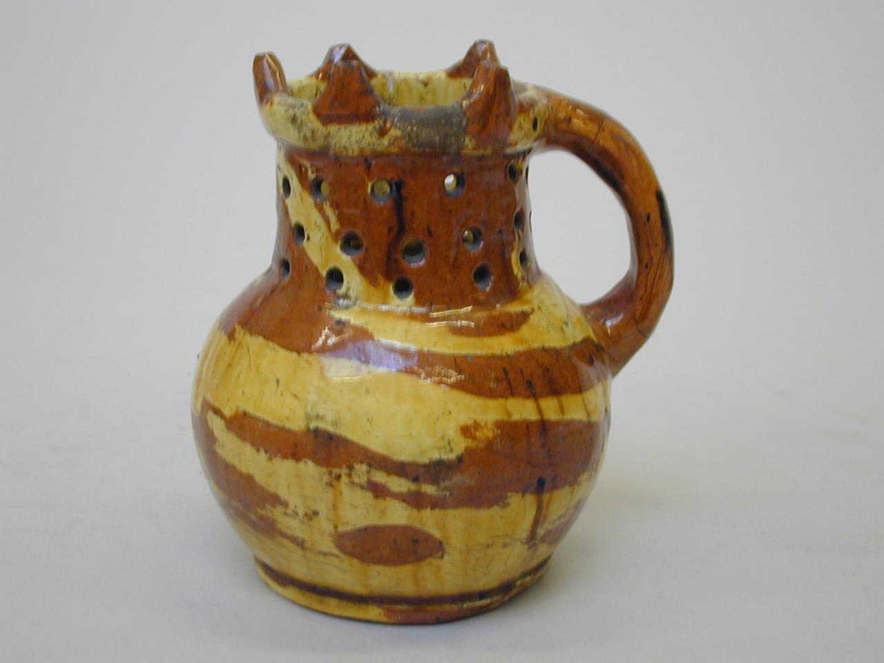 - A puzzle jug of red earthenware the body coated with a brown glaze decorated with splotches and stripes of yellow. The neck of the jug is pierced with a pattern of circles. The rim has five short spouts facing upwards.