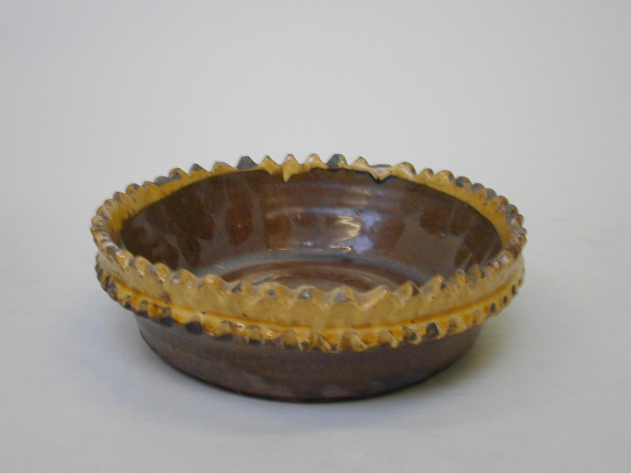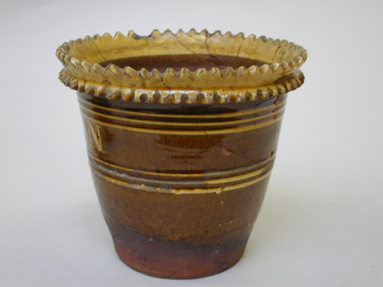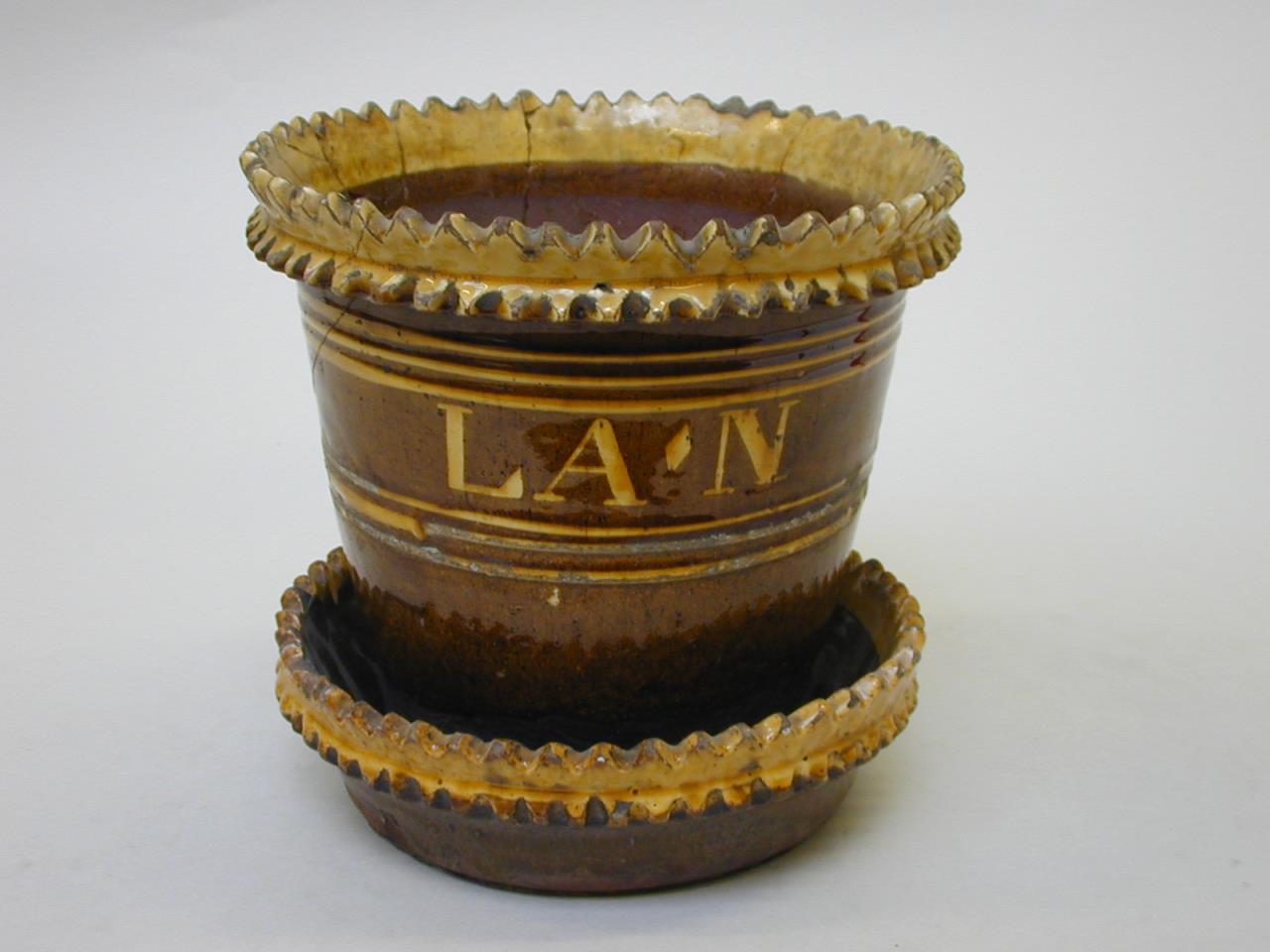 - A flower pot and stand of red earthenware; glazed brown, the glaze not extending to the base. The top edge and a band below are serrated and coloured yellow. The sides of the pot have two bands of three lines of yellow slip, with an inscription inbetween also in yellow slip. red earthenware.