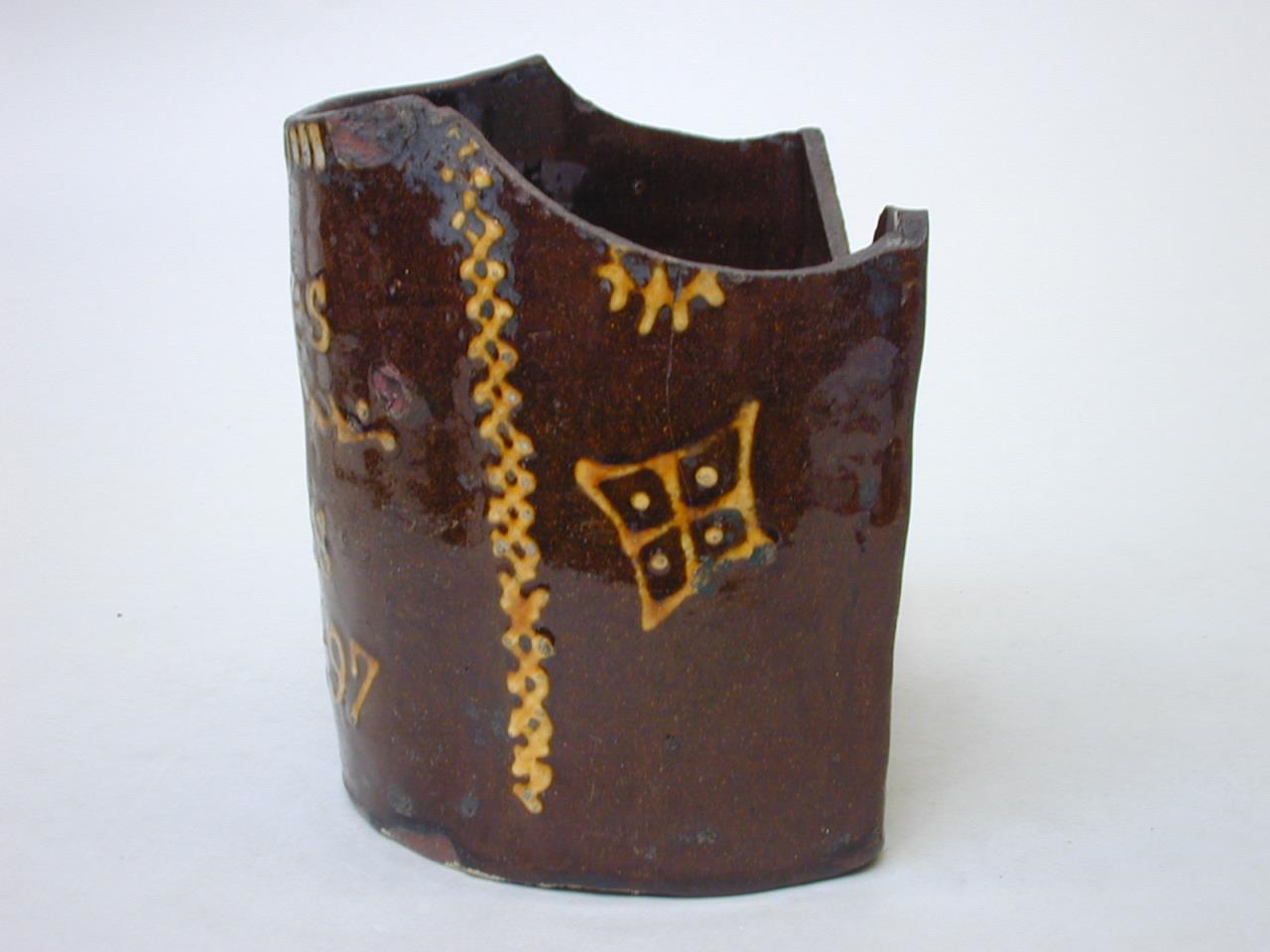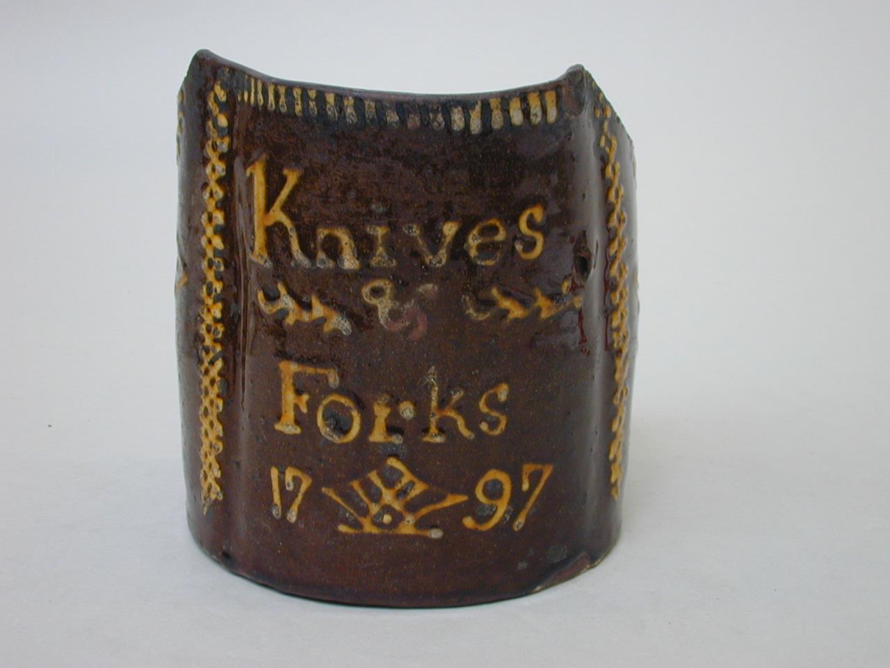 A red earthenware knife and fork box covered with a brown glaze. The semi-circular front is decorated with an inscription and date in cream slip. The inscription has a geometric border with geometric patterns on the sides of the box.