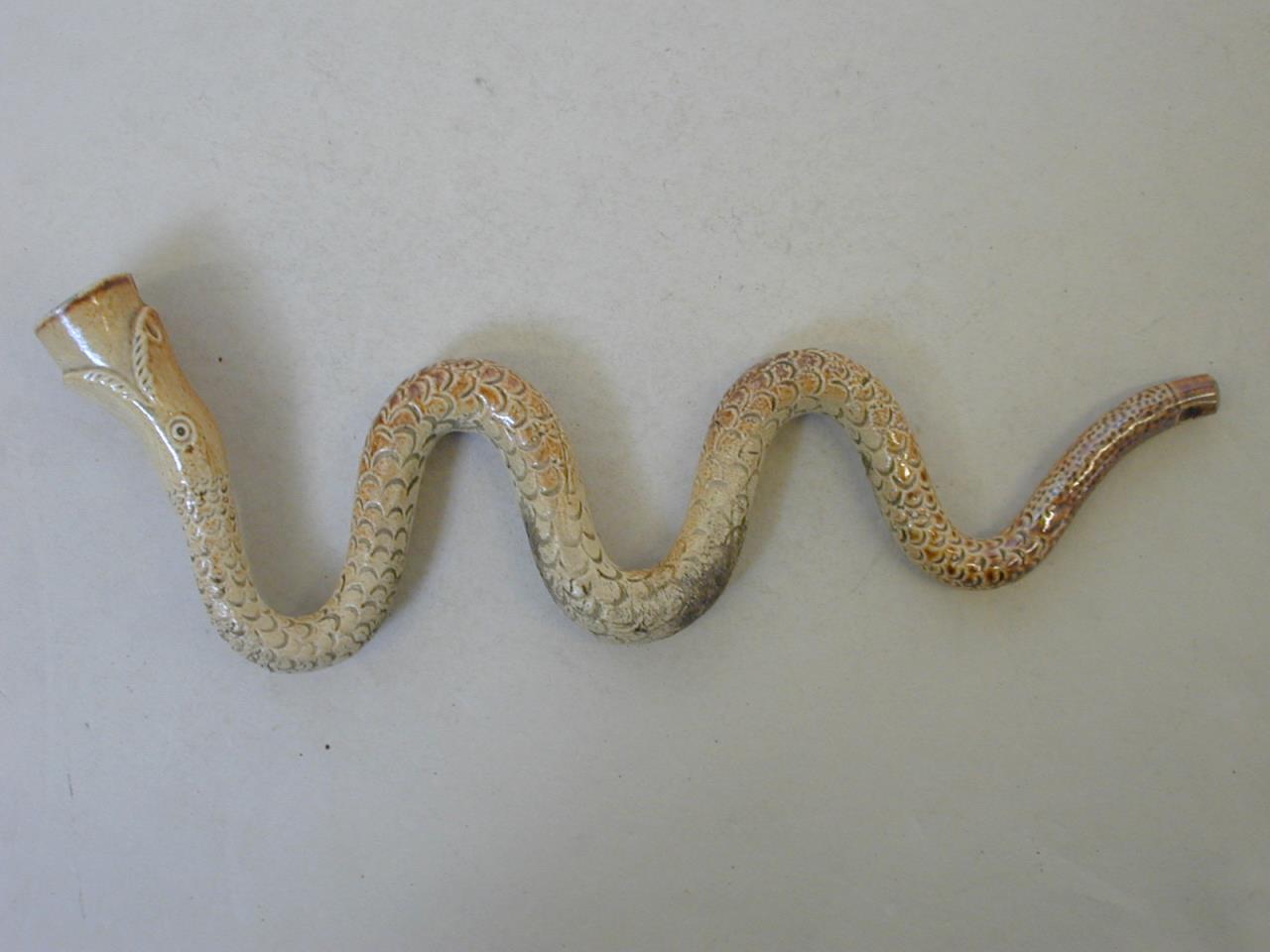 - A salt glazed stoneware tobacco pipe in the shape of sinuous snake. The stem is moulded with scales, the bowl formed from the snake's open mouth. The pipe is buff coloured with brown glaze around the stem and along the top of the pipe.
