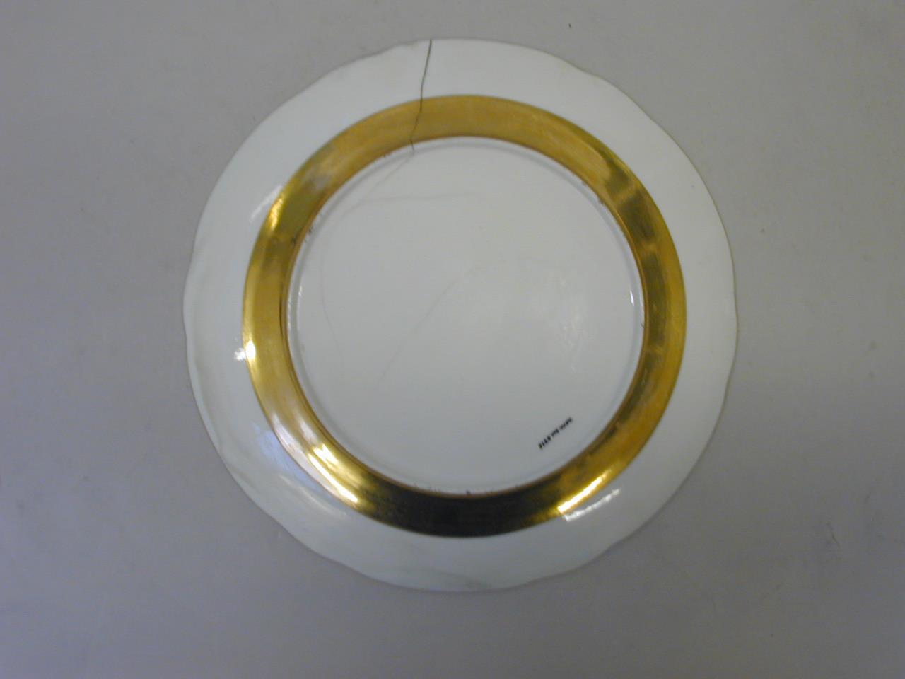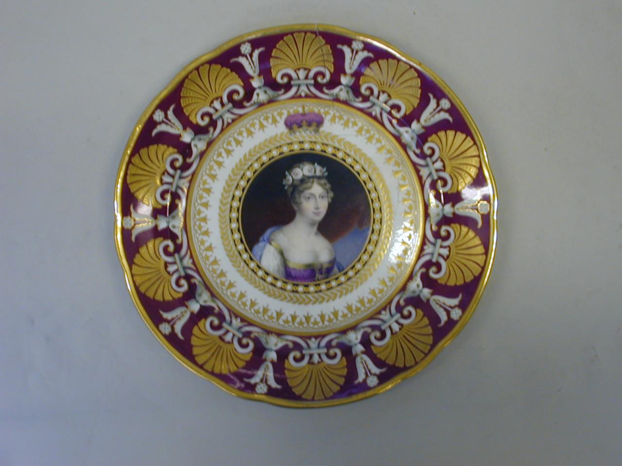 A porcelain plate with the central well painted with a portrait of Queen Charlotte(?) in colours, bordered with gilt foliage and a blue enamel border with moulded 'pearls' in relief. The bevel of the plate has a dark red ground decorated with gold shells interspresed with flowers and scrolling in white and gold. The underside of the plate has a broad gilt band above the foot rim.