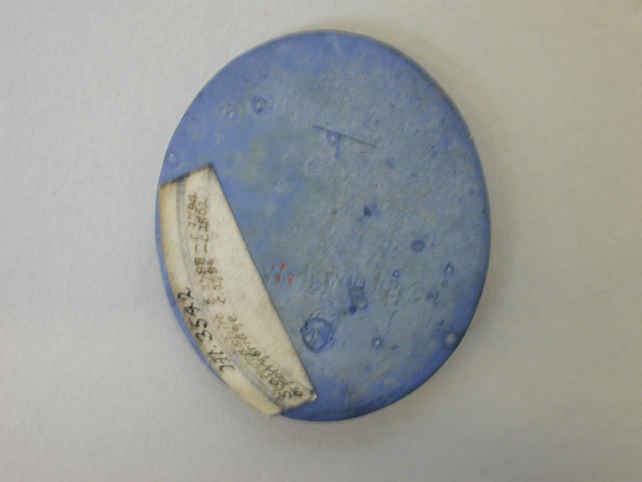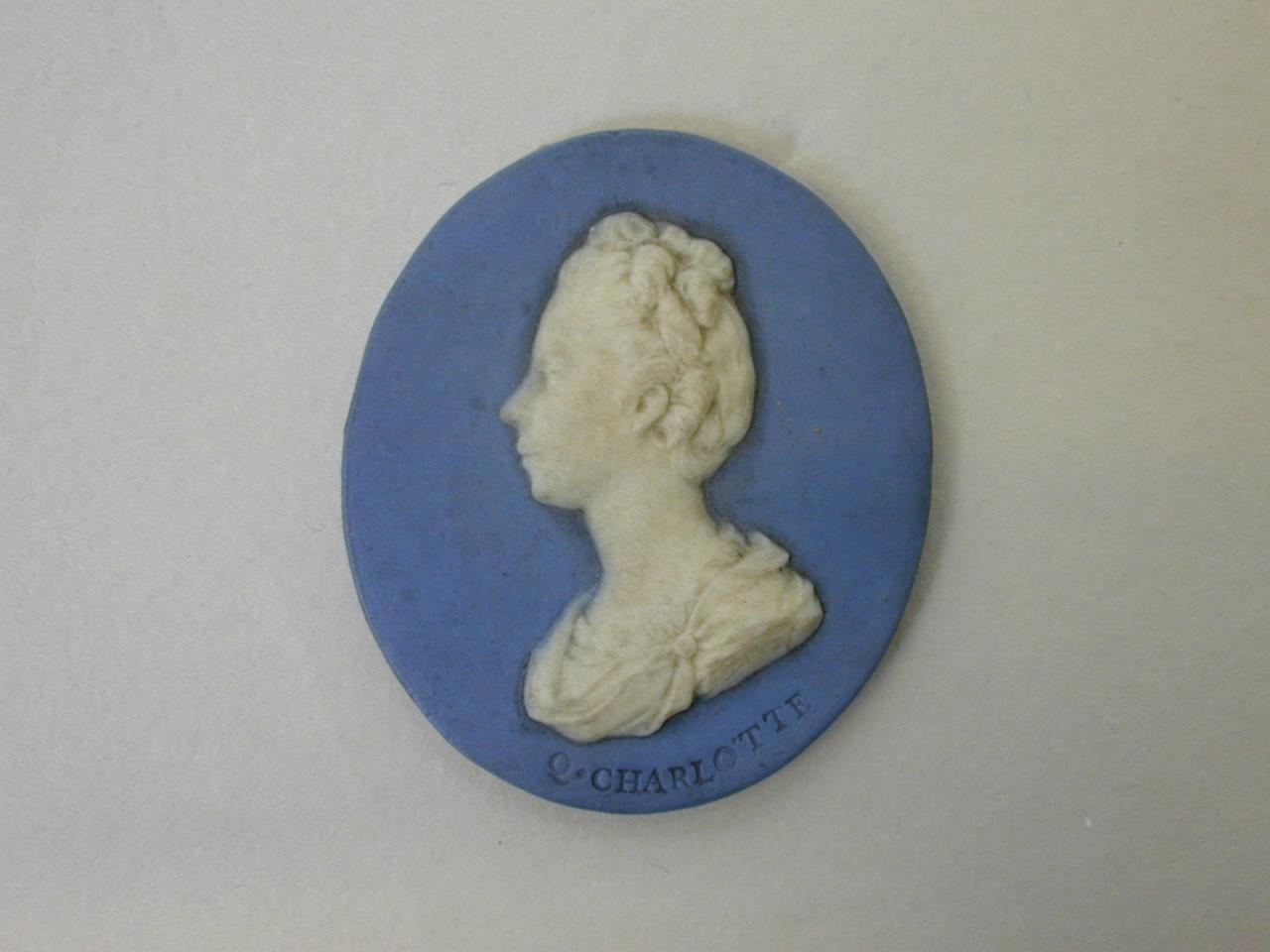 - A small oval Jaspar ware cameo with a relief moulded bust of Queen Charlotte, in white on a blue ground.