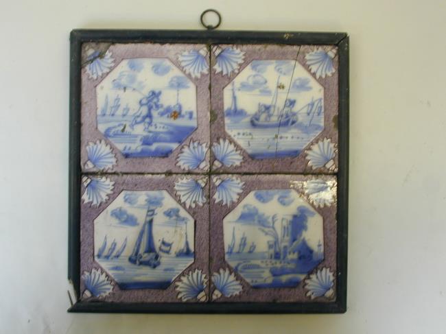 - A set of four Delft tiles in a wooden frame. Each tile is mottled manganese purple with reserve fan motifs in the corners and have central octagonal scene in underglaze blue of landscapes with boats and fishermen.