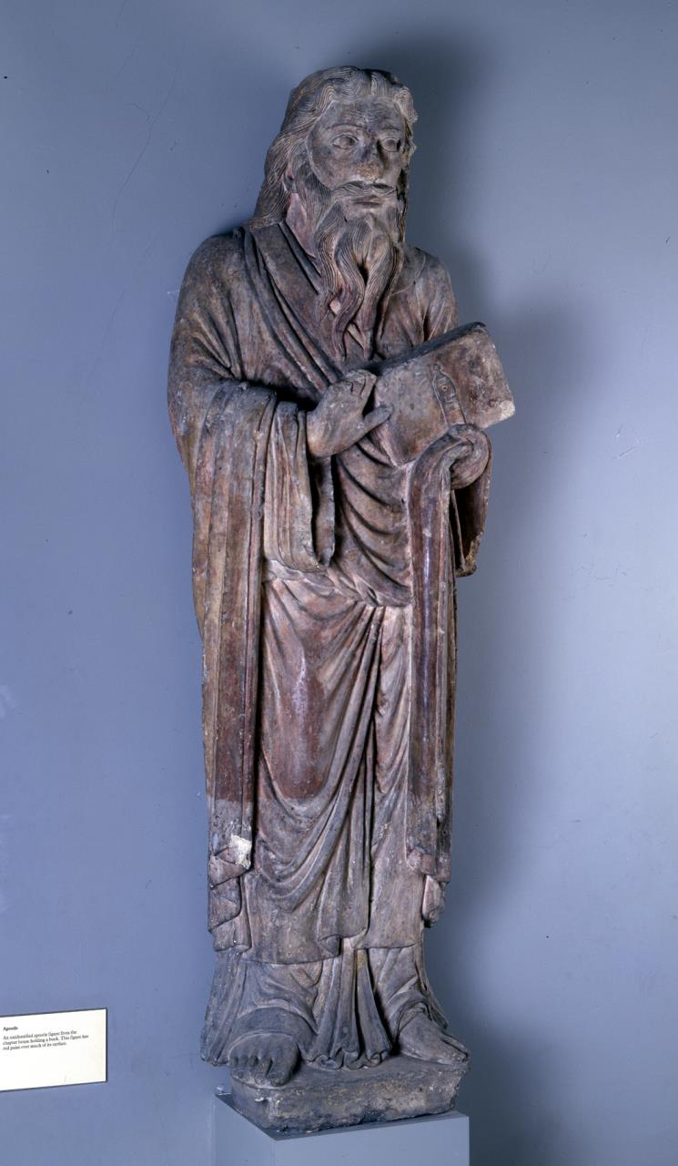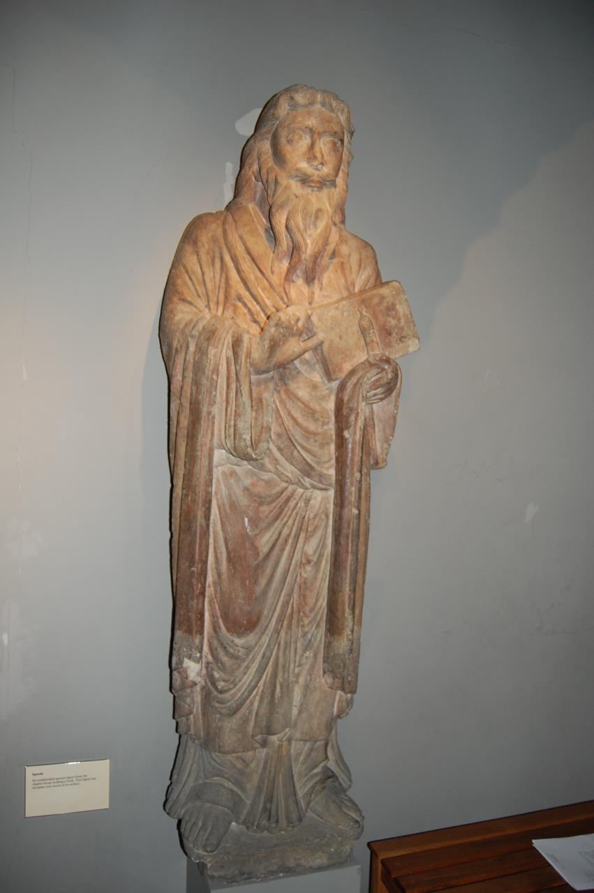 - Life-sized figure of an apostle holding a book. Remains of red colour on stone.