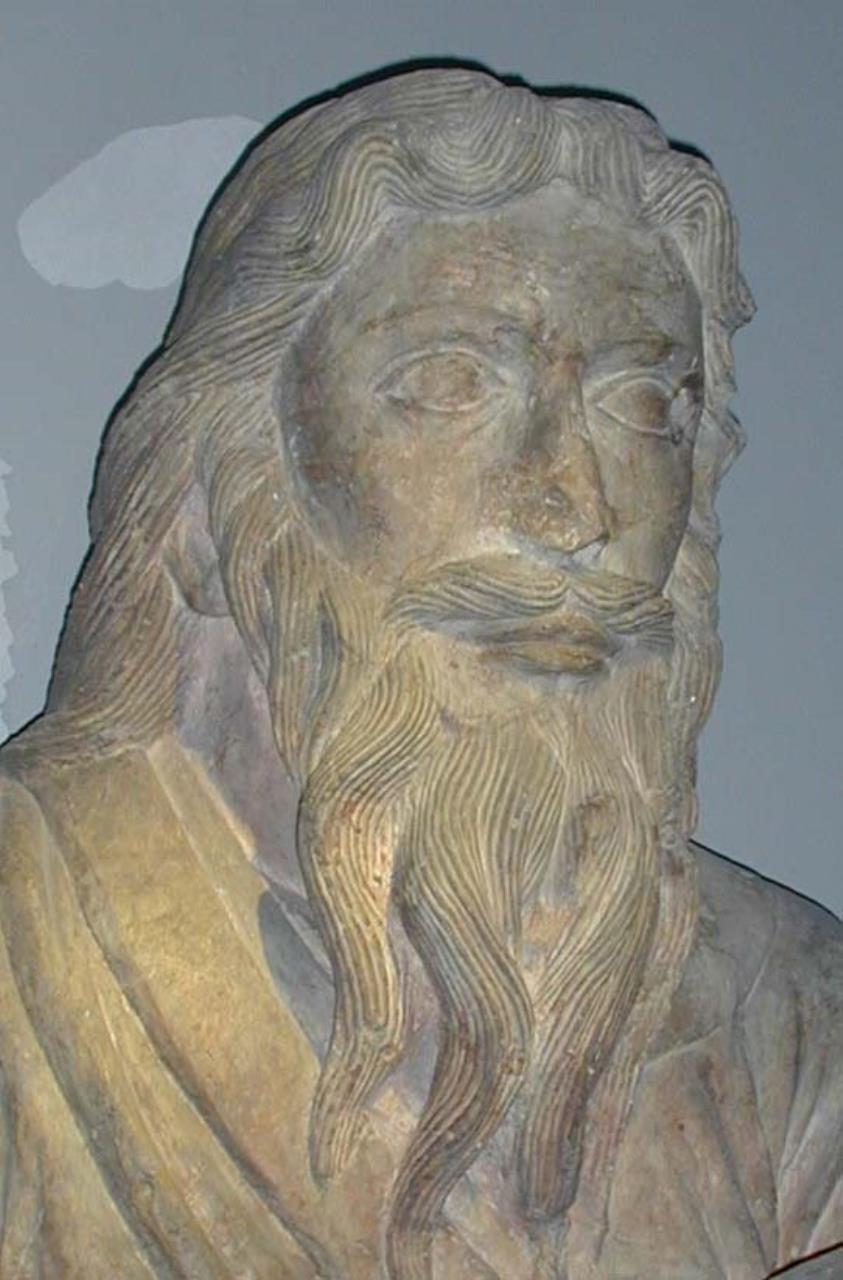 - The figure has both long hair and beard. The book, which has a clasp, rests in the crook of his left hand.