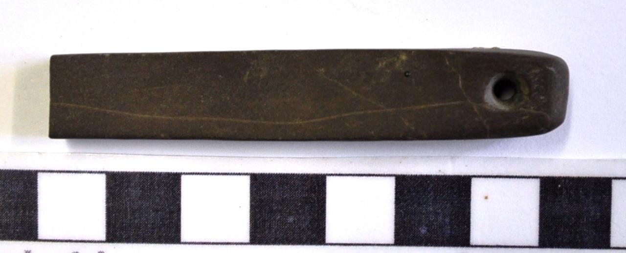 - Rectangular section, flaring slightly towards head. Pierced for suspension. Broken towards base.