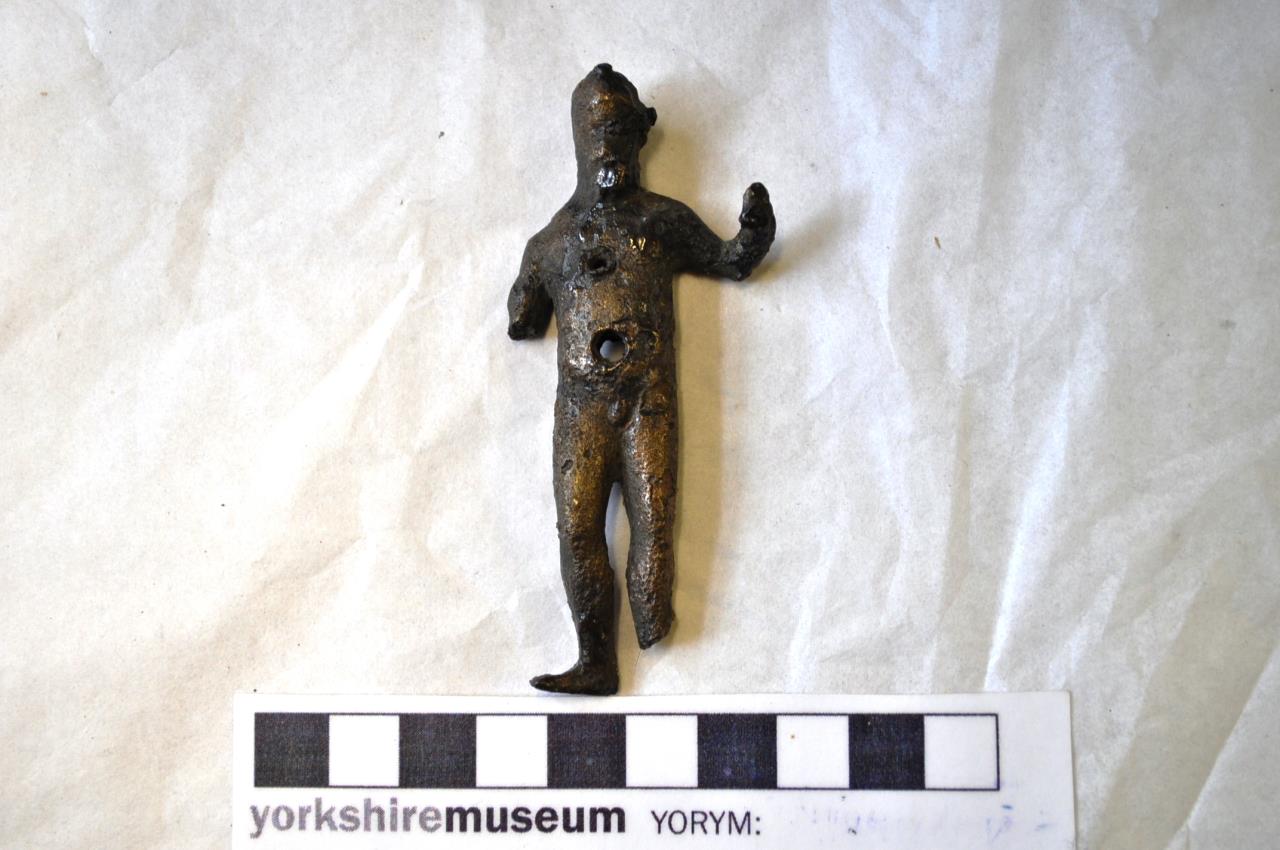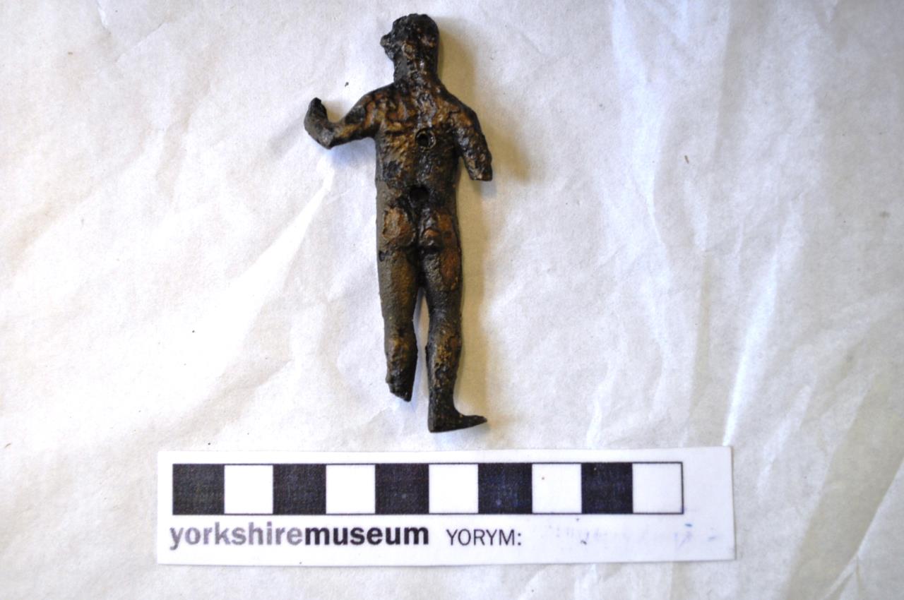 - Naked male figure with long beard and helmet. Right arm partially missing and left foot also. Looks as if he would be holding a spear or a pole in left hand. Two holes driven through torso.