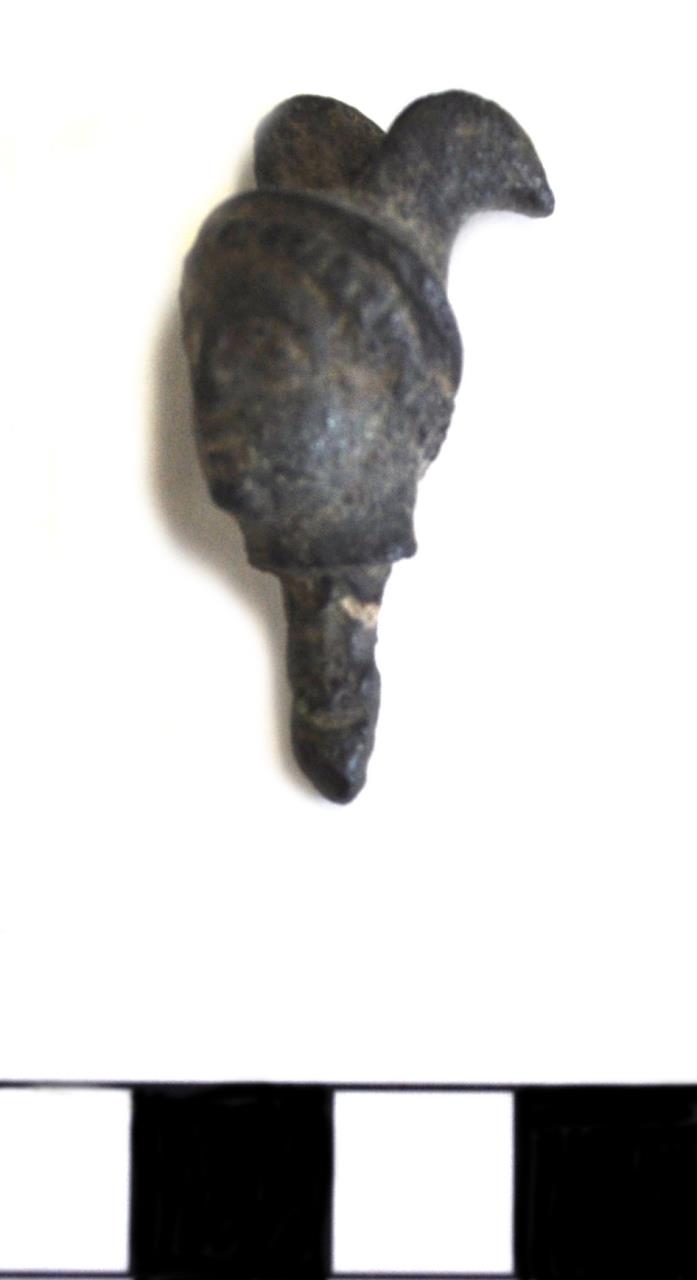 - Incomplete copper alloy figurine. Head of Mercury; moulded face with large eyes and ringlet hair beneath a winged helmet. A tapering square-section shank extends down from the neck and would have affixed into the body of the figurine.