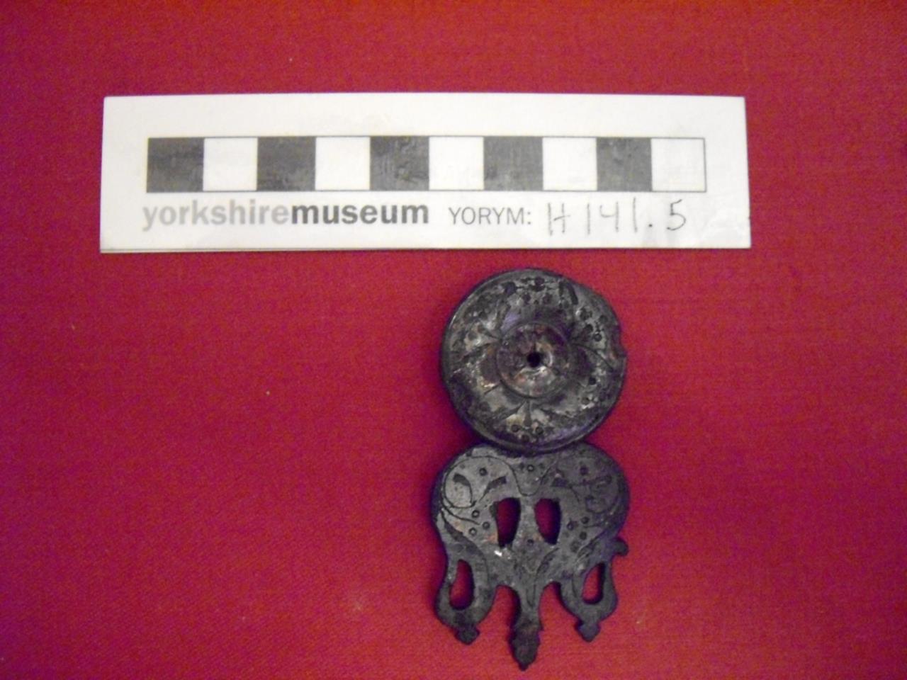 - Circular disc with triple loops supporting a pelta-shaped pendant.
