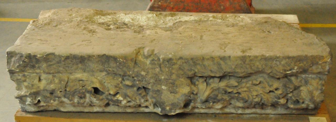 - Cornice; elongated rectangular stone with medium relief floriate decoration on the front face.