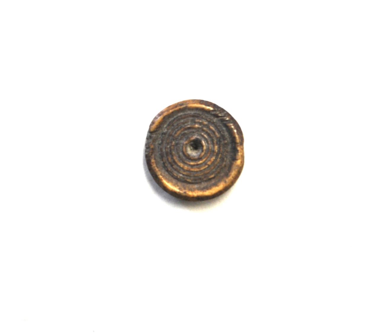 - Discoidal bone counter, plain backed, with incised concentric circular decoration on upper face and a circular depression in the central boss.