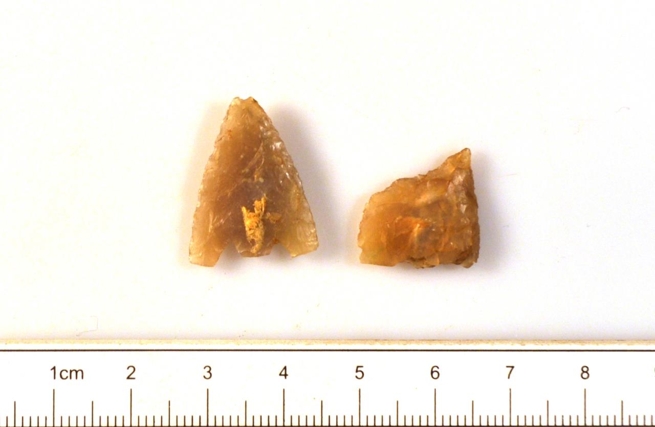 - Two arrowheads; one barbed and tanged (Green low type), broken at the point and tang, with shallowly curving cutting edges and one leaf-bladed arrowhead (Green type 4a) with only distal end and point surviving. Transluscent flint.
