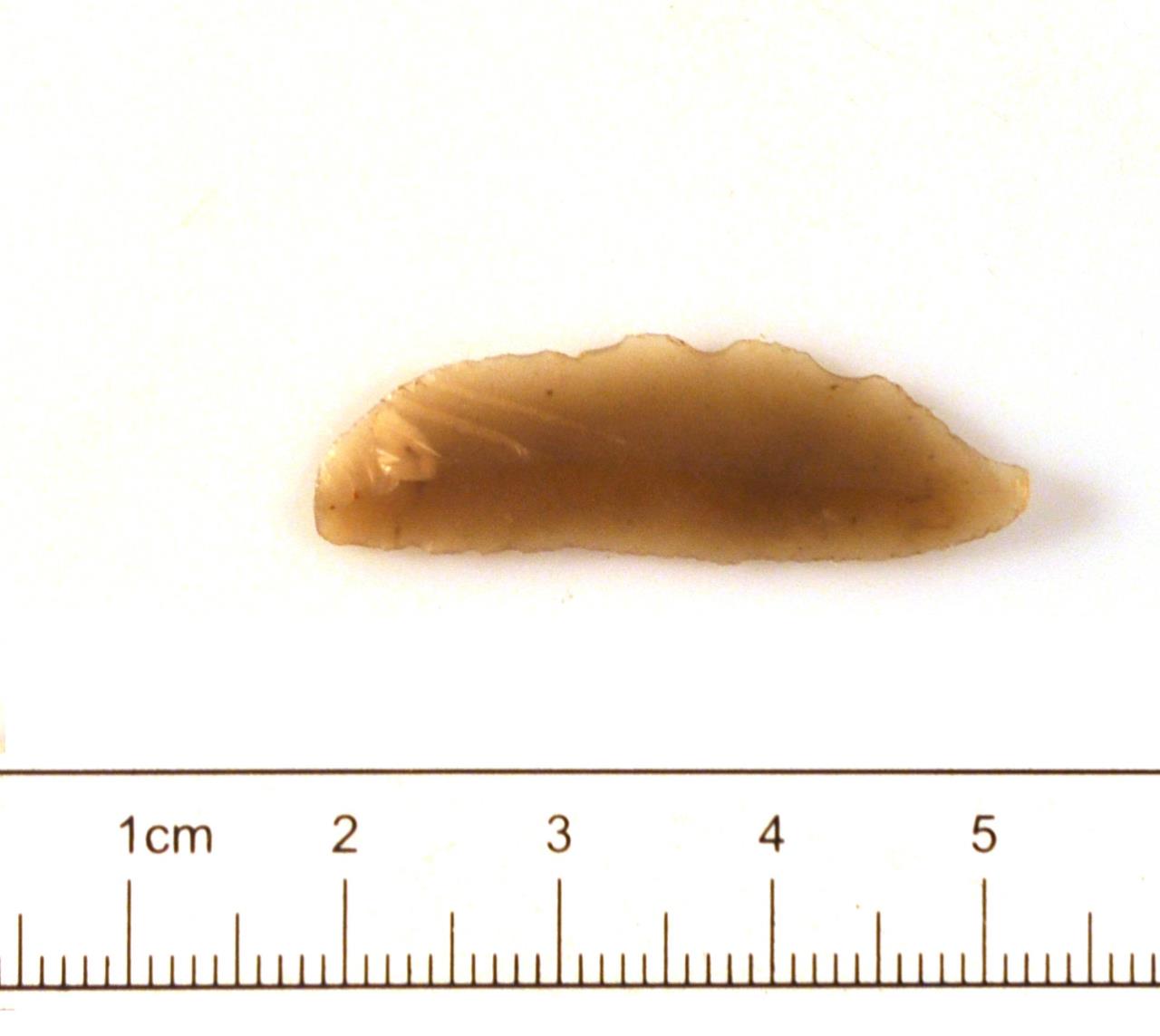 - Retouched flint flake, with three denticulate teeth on left cutting edge. Edge-wear usage evident on unworked right edge. No bulb of percussion, but significant conchoidal ripples accross length of ventral surface. transluscent light-grey flint.