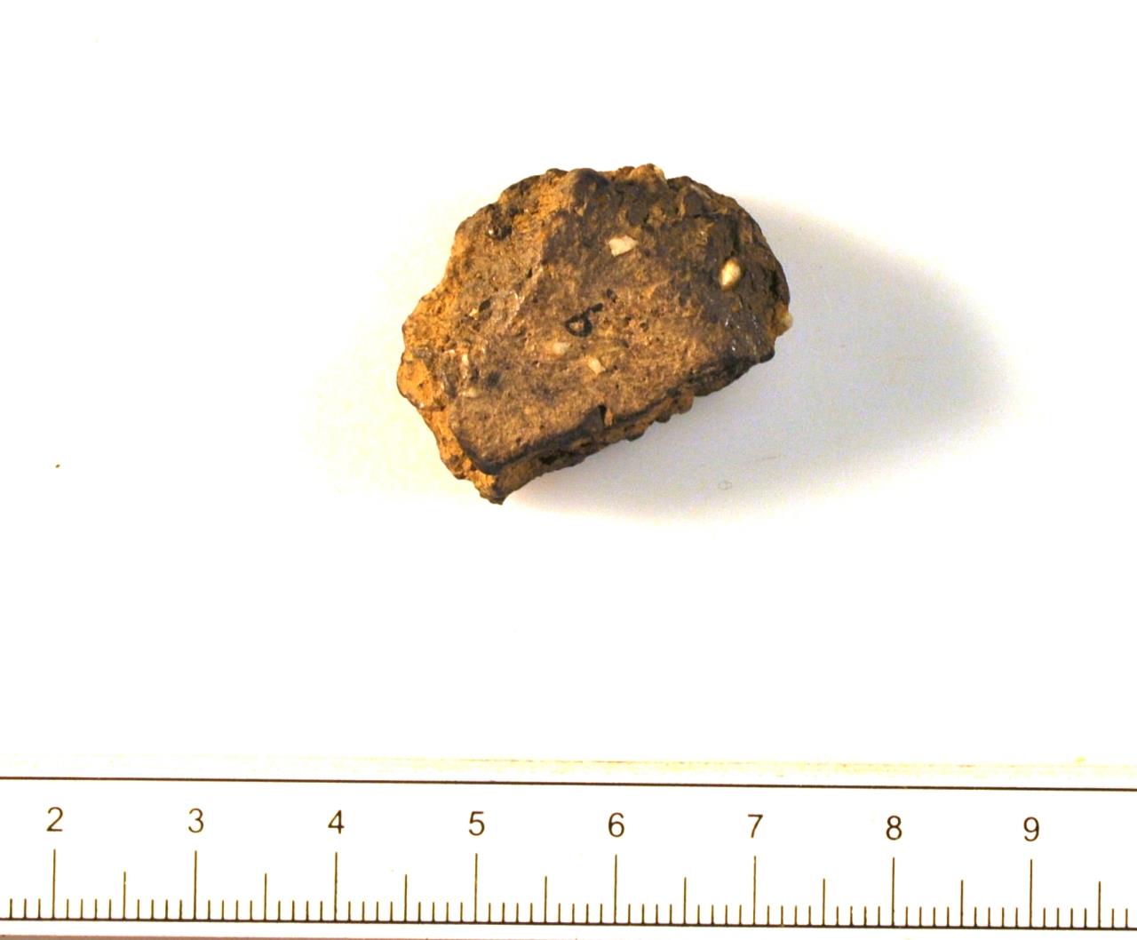 Coarseware ceramic vessel sherd; thick material, dark grey-black in colour with infrequent large inclusions (C. 5% at 0.5-3.0mm) of probable felspar. Late neolithic or early bronze age material.
