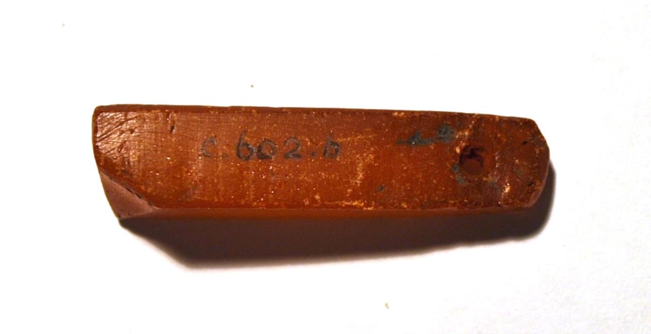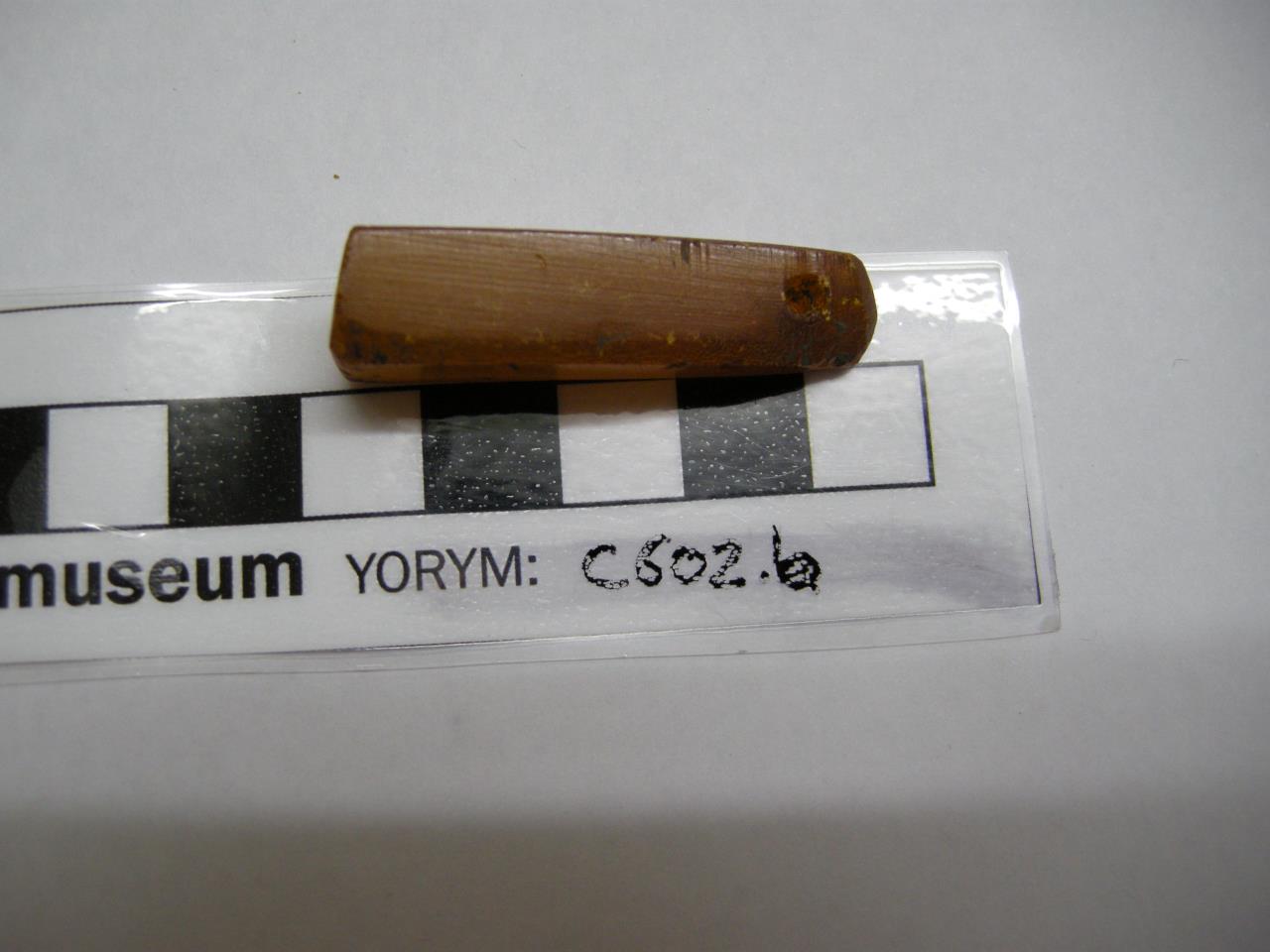 Waterman 1959 describes this as a bead and details this, others, and their find spot: 'It has been suggested that the Clifford Street finds indicated the existence nearby of artisan's workshops, by reason of the numerous unfinished or spoiled objects included with the material recovered in 1882, and it is clear that the manufacture of amber and glass beads was carried out in the vicinity. Much unworked amber, together with rough-outs and spoilt and finished beads of this material, as well as glass slag, glass 'drops', unperforated or imperfectly pierced and finished glass beads in fragmentary condition point to this conclusion. The finished [amber] beads are of two forms; type 1, ideally of truncated pyramidal shape but showing considerable variation [as this example]; type 2, cylindrical or disc-shaped varying thickness and cross-section. The method of manufacture appears to have been the same: to cut the raw amber roughly to shape, to bore the perforation (during which process many of the beads appear to have been broken and discarded) and finally to grind or polish the surface to a smooth finish... The edges of beads of type 1 are often bevelled or slightly rounded... Amber beads of type 1 are known during Viking times in Scandinavia...'