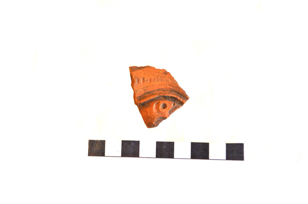 - Facial sherd of a face pot (face urn). Right-side eye only. The eye, iris, pupil and lid are all depicted. A series of parallel vertical lines depicts the eyebrow above.