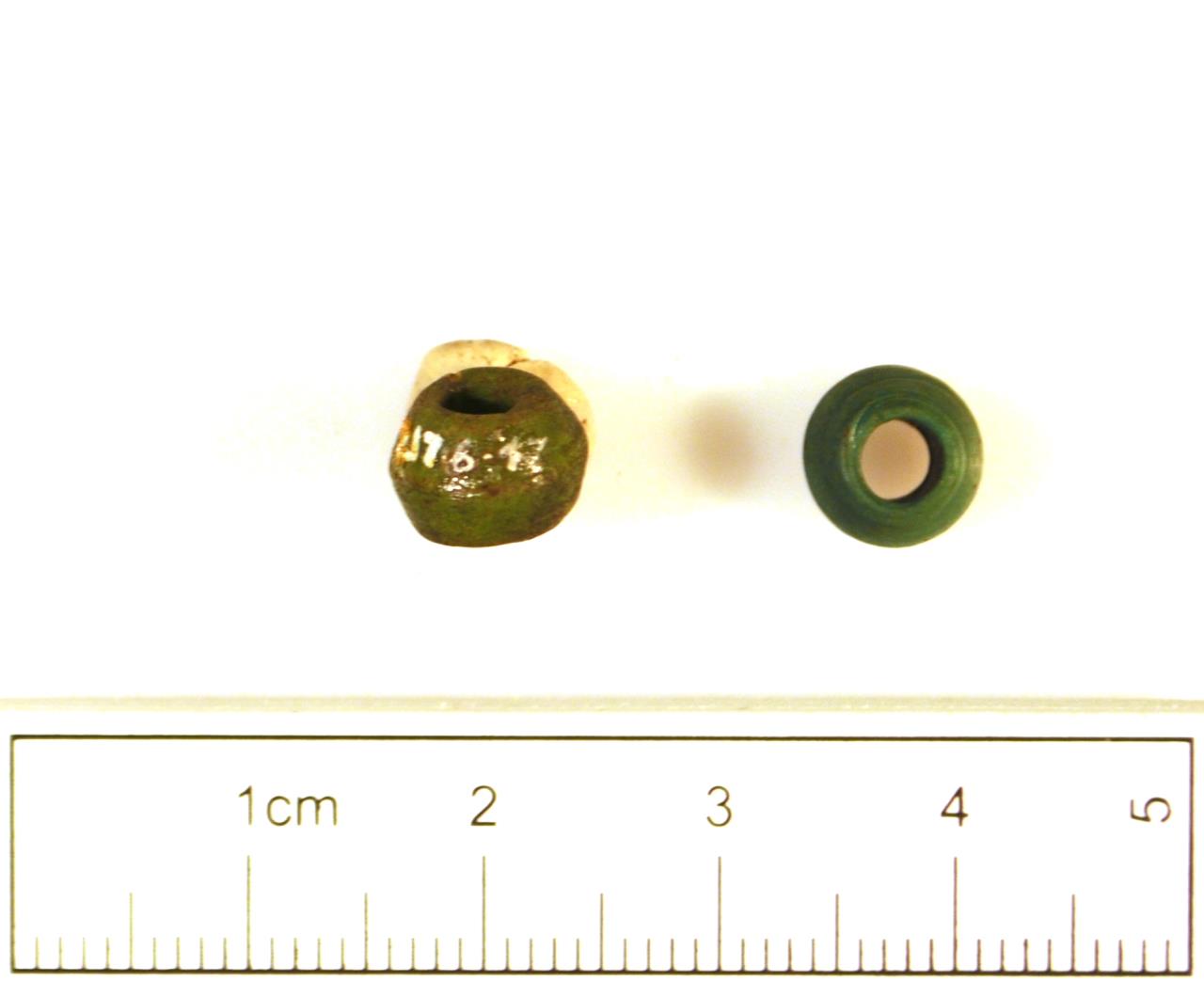 - Two small biconical green glass beads. The larger with traces of brown running throughout and the smaller has brighter colouring.