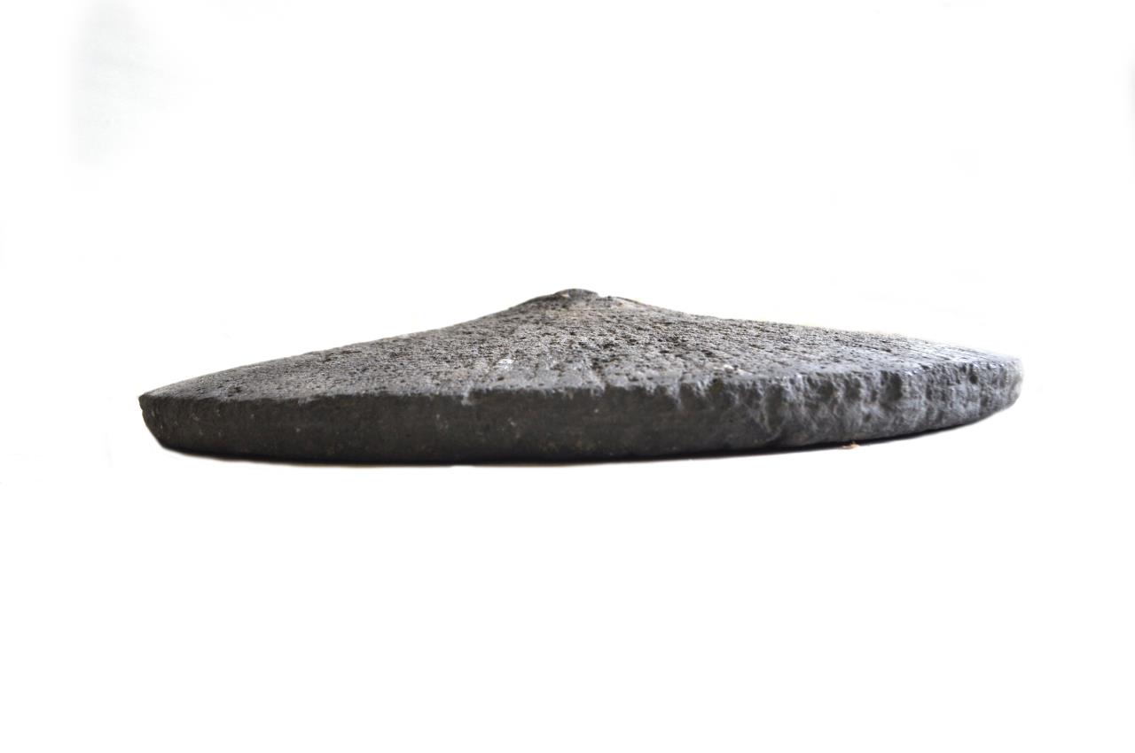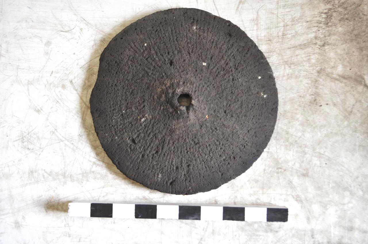 - Convex discoidal quern, with raised socket and non-direction harping. Lava quern.