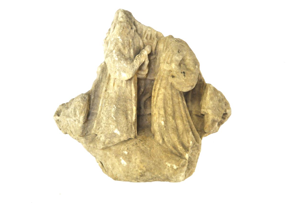 - Incomplete and weathered altarpiece fragment depicting two robed figures facing each other (heads missing). Interpreted as Walter Harvey Brook as the lower part of the Annunciation scene. Hargrove Collection.