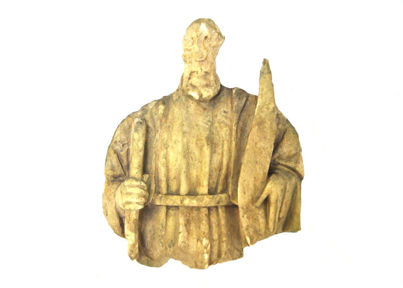 - Incomplete and weathered altarpiece fragment. A male figure, possibly Moses, facing forward. Head and torso only - head damaged above the nose. He is robed, wears a two-pronged beard and holds a short-staff in his right hand. His left hand holds a large, flat-fronted, curved object (possibly a tablet).