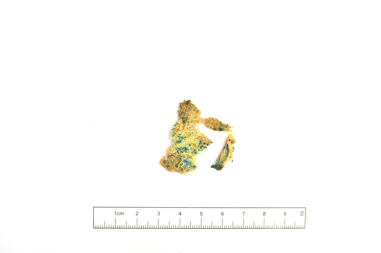 Fragments of textile found with Edward I and Edward II coin hoard. Report written by P.Walton 1986: Tabby weave linen fragment of off-white base with blue and green spots. Tabby weaves of this type were used throughout the medieval period, for shrouds, linings, undergarments, table linene etc. Wilton and Alysham were early centres for linen-weaving, but it is probable that similar products were being made throughout the coutnryside. Thread count: 15x18 threads per cm Yarn: z-spun in both warp and weft Weave: Tabby (plain weave)