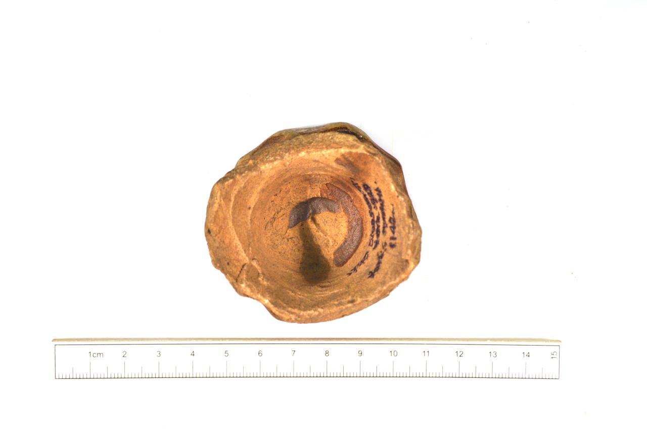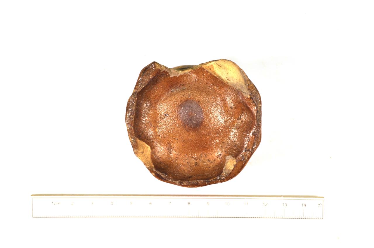 - Stoneware base from a small jar, salt splash glaze on exterior and base with hand moulded skirt surrounding base.