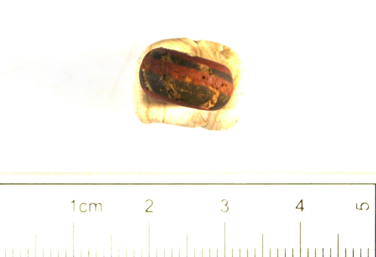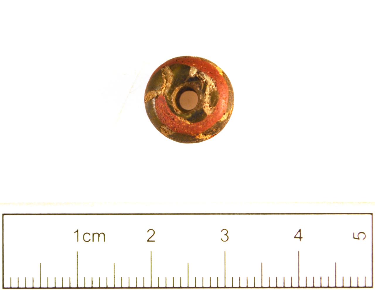 - A thick annular bead; dark green or black glass with red spiral running from the top and around the face with white wave lines perpendicular to red.