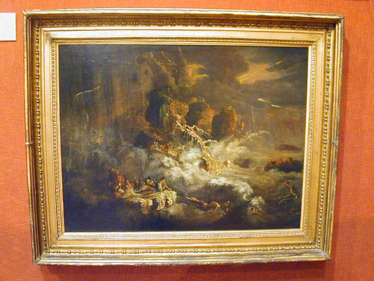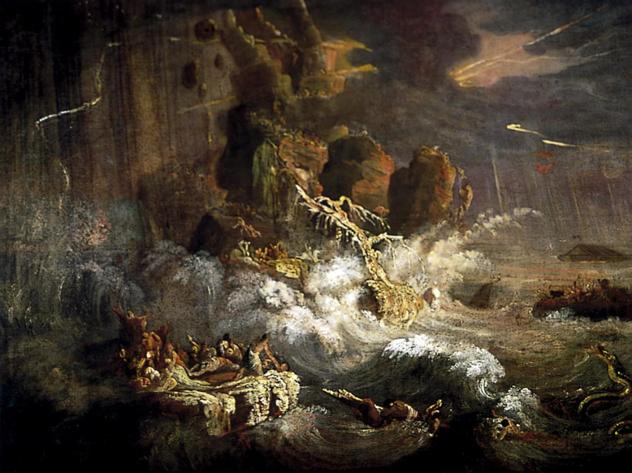 - In the foreground a violent stormy sea; small figures are clustered on rocks; a huge serpent rears up, on the right. In the background loom massive cliffs, while the Ark floats on a placid sea on the right.