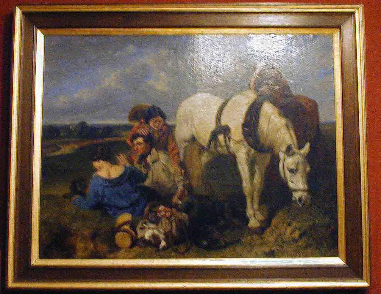 - In a rolling landscape, a young man blows pipe smoke into a girl's face but is restrained by a second girl; two harnessed carthorses stand to the right.