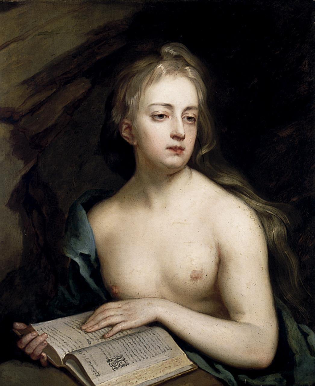 - The Magdalen reconciled. A half-length figure looking half left, her breast bare. Her left hand rests on an open book; she wears a loose blue drapery and her fair hair flows down her shoulder. From the top right corner comes a ray of light, symbolic of the vision of Glory. To the left are bare rocks.