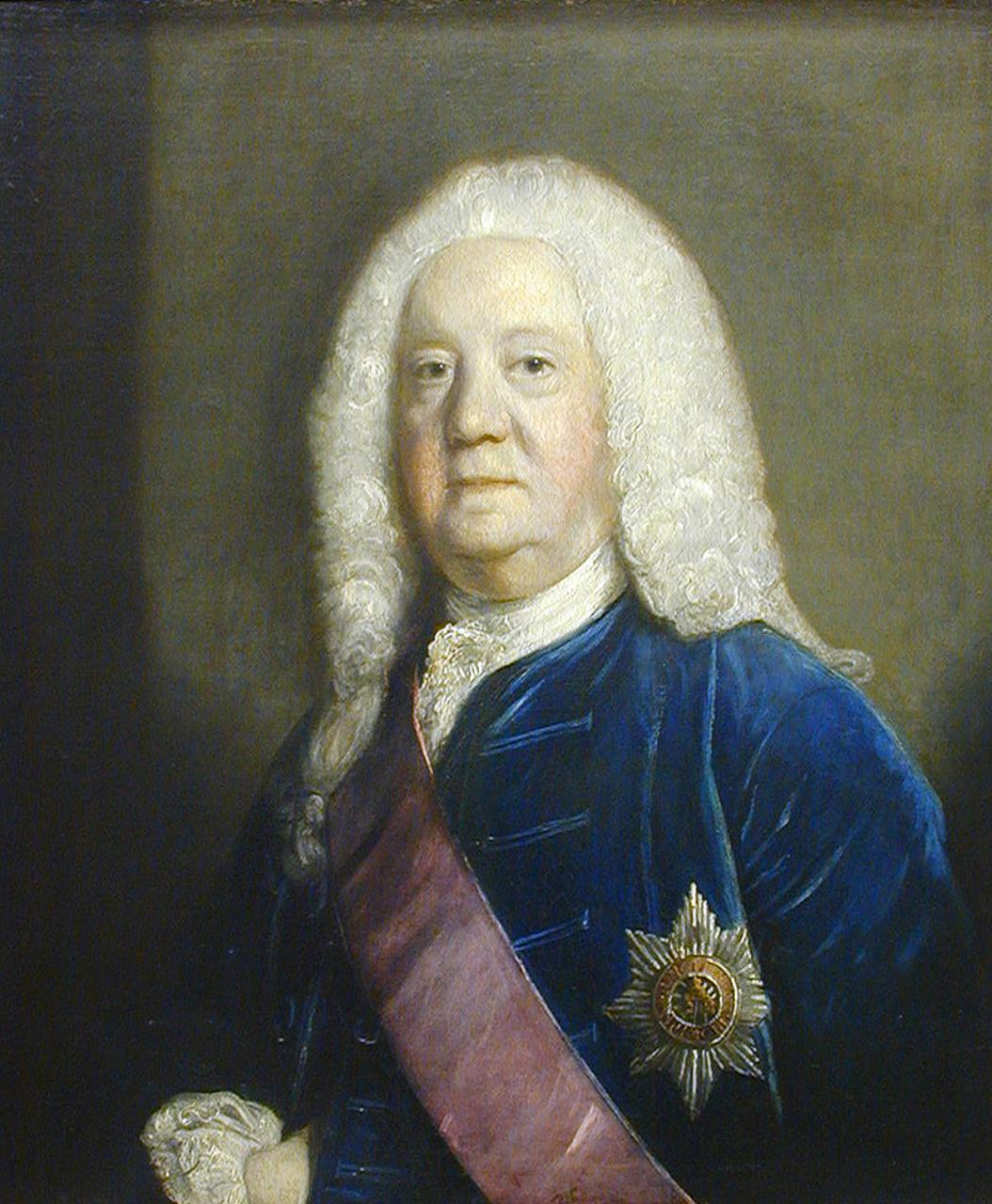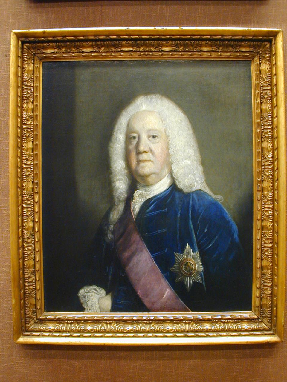 - Half-length figure looking half left. He wears a Ramillies wig and the ribbon of the Bath is sewn on his blue coat. His right hand is tucked inside his coat.