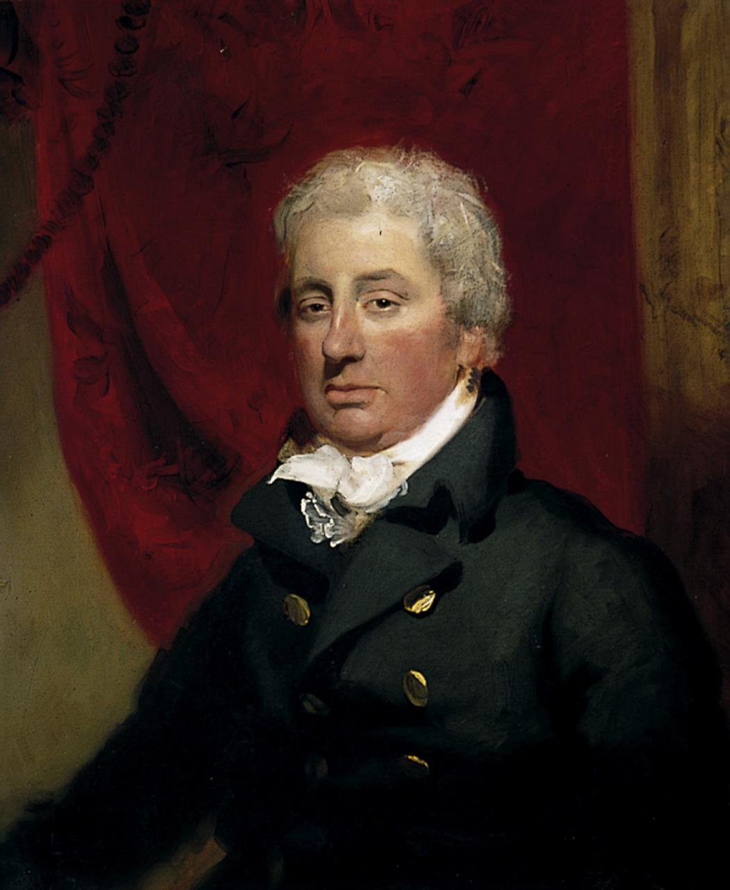 - Half-length surly looking figure, looking half left; white cravat, dark blue grey coat with brass buttons. A red curtain is draped behind him.