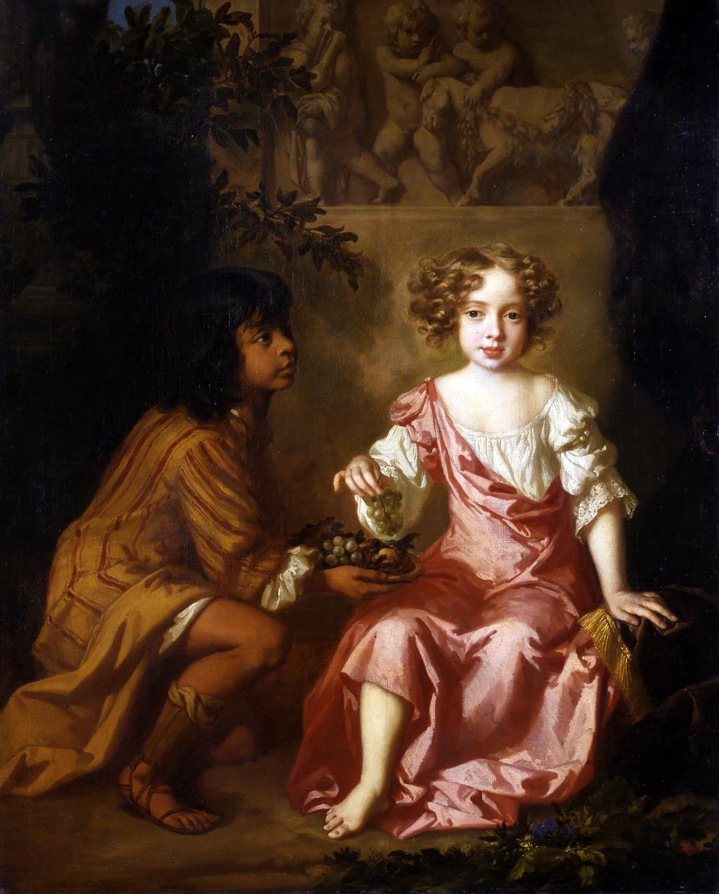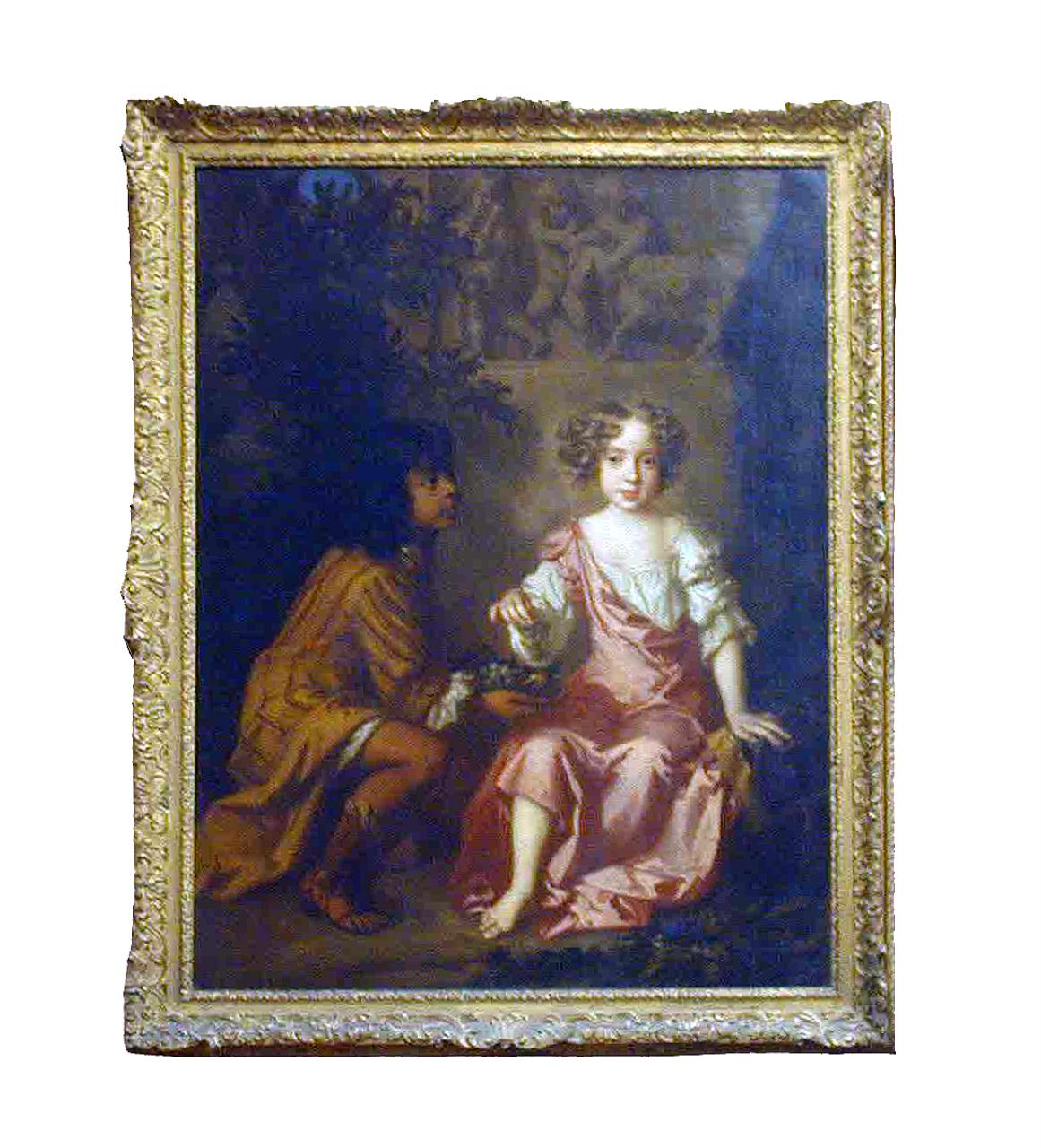 - A young girl richly dressed in red silk and a white chemise is seated right: she takes grapes from an Indian servant who kneels on the left. Behind, on a stone wall, a bas relief (after Duquesnoy, 1594-1643). A tree extreme left, a drapery hanging extreme right.