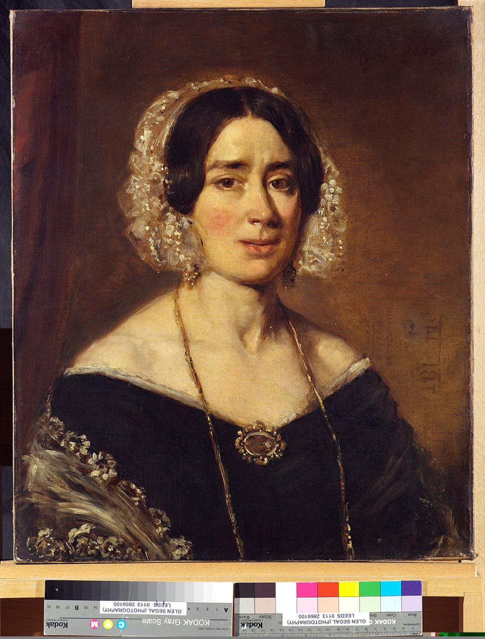 - Head and shoulders study of a dark haired, middle-aged woman wearing a white lace cap and a black d?llet?ress.