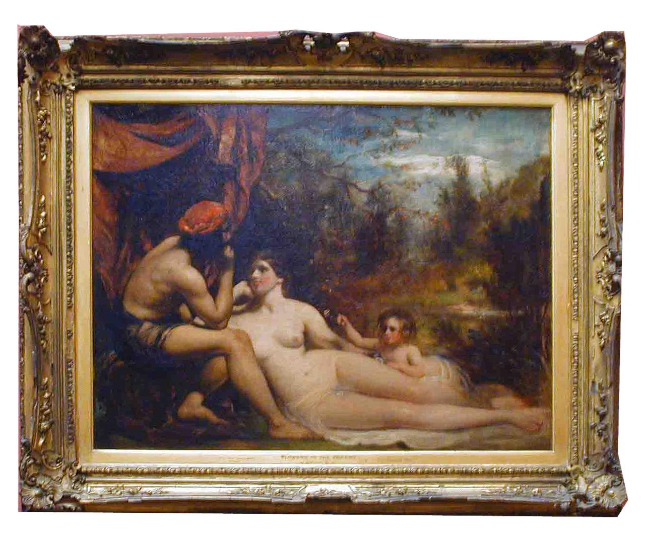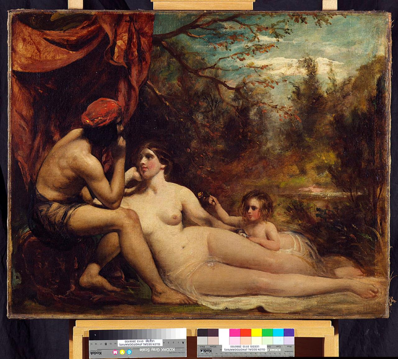 - Three lightly draped figures: centre a woman reclining: left a man sits, his head in his left hand. A small child, left centre, proffers a flower with her right hand. A landscape background, with, left, a red awning hanging from a tree.