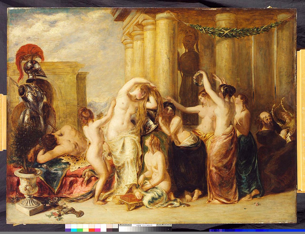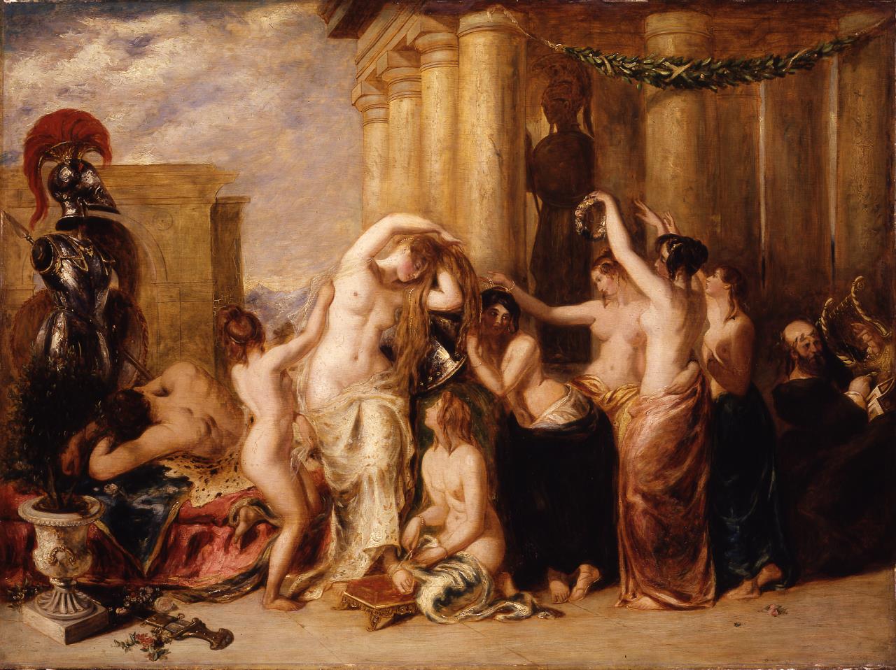 - In a setting of classical columns and architecture Venus, centre, stands half draped attended by six maids who perform her toilette. Extreme left stands a suit of armour, with Mars sleeping on a couch beneath. Extreme right a garlanded, bald musician plays the harp.